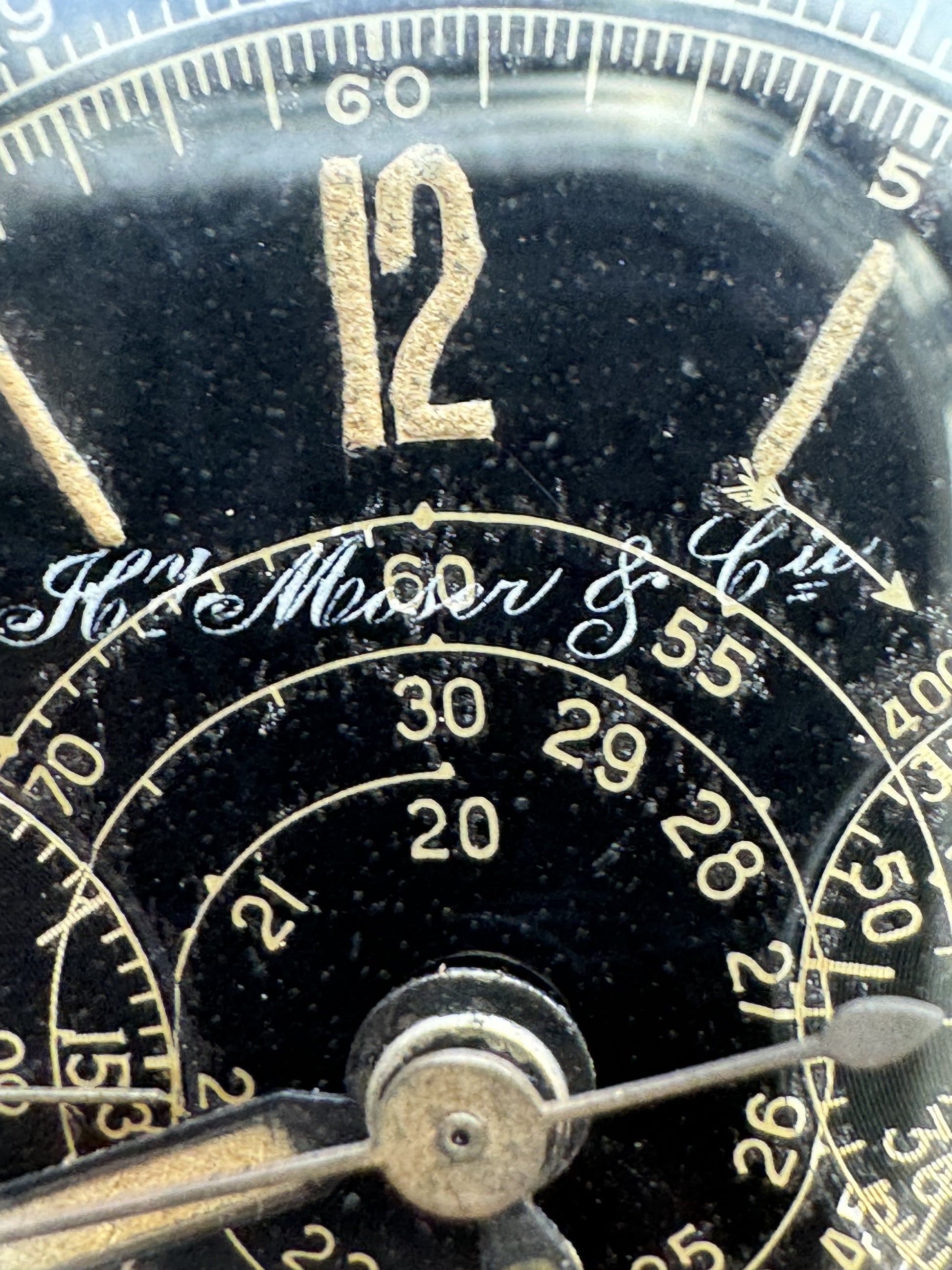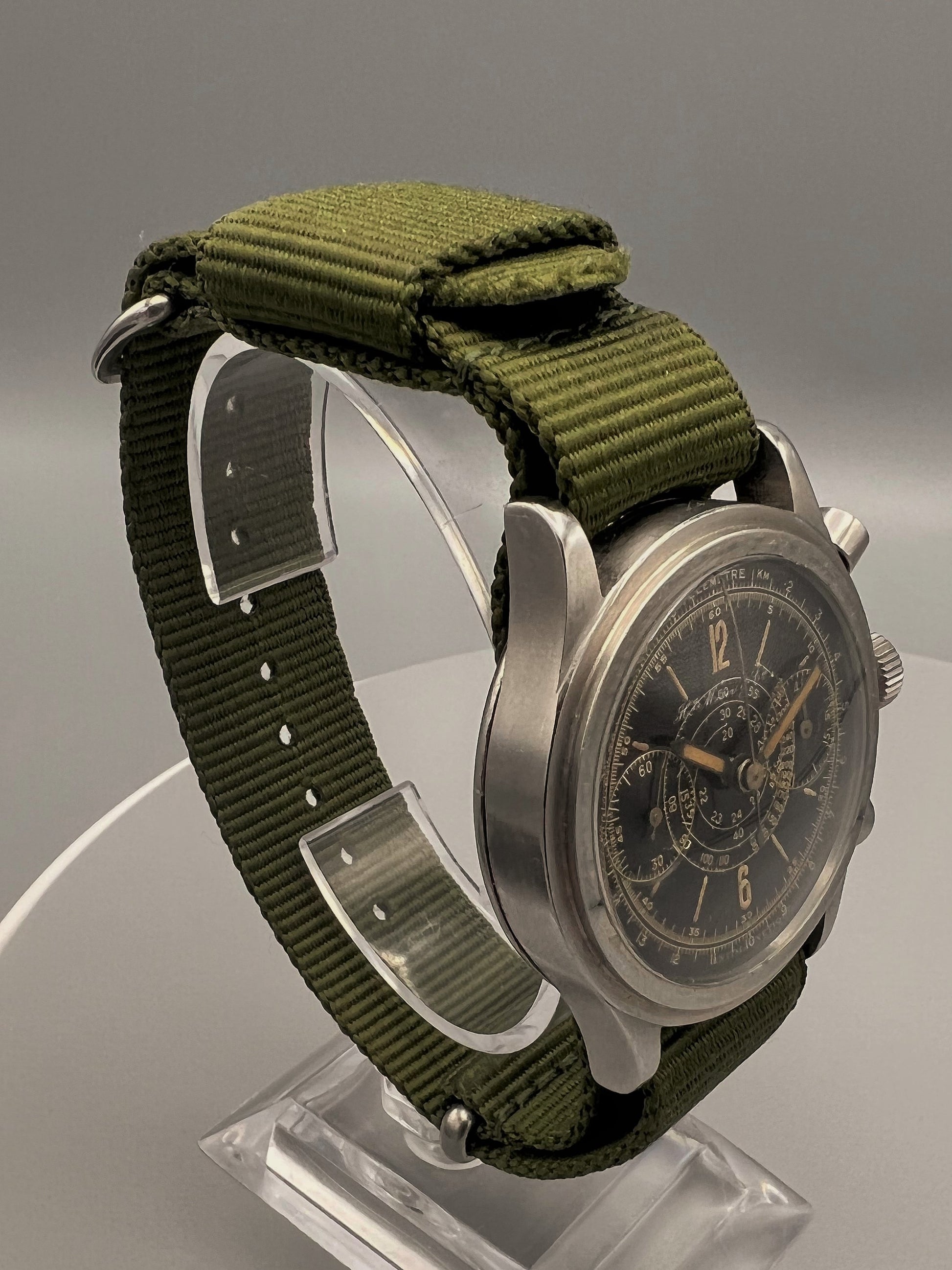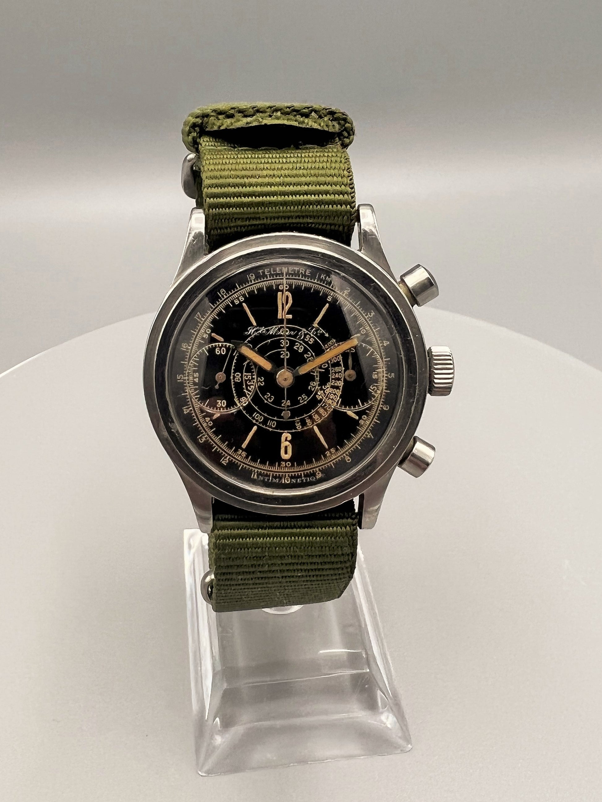 H. Moser & Cie, a very rare, oversized stainless steel chronograph, w/ black lacquer gilt printed dial, 1945