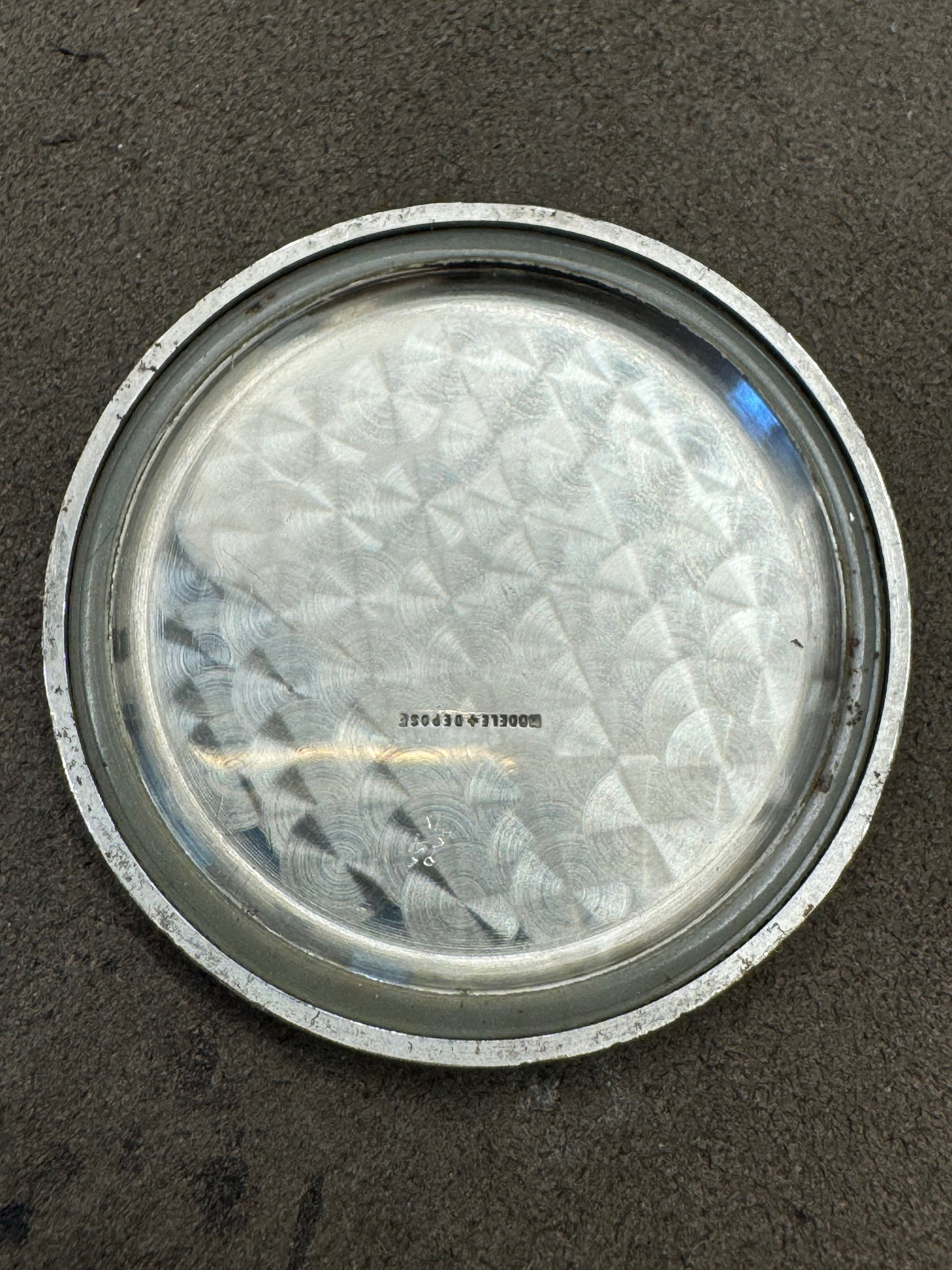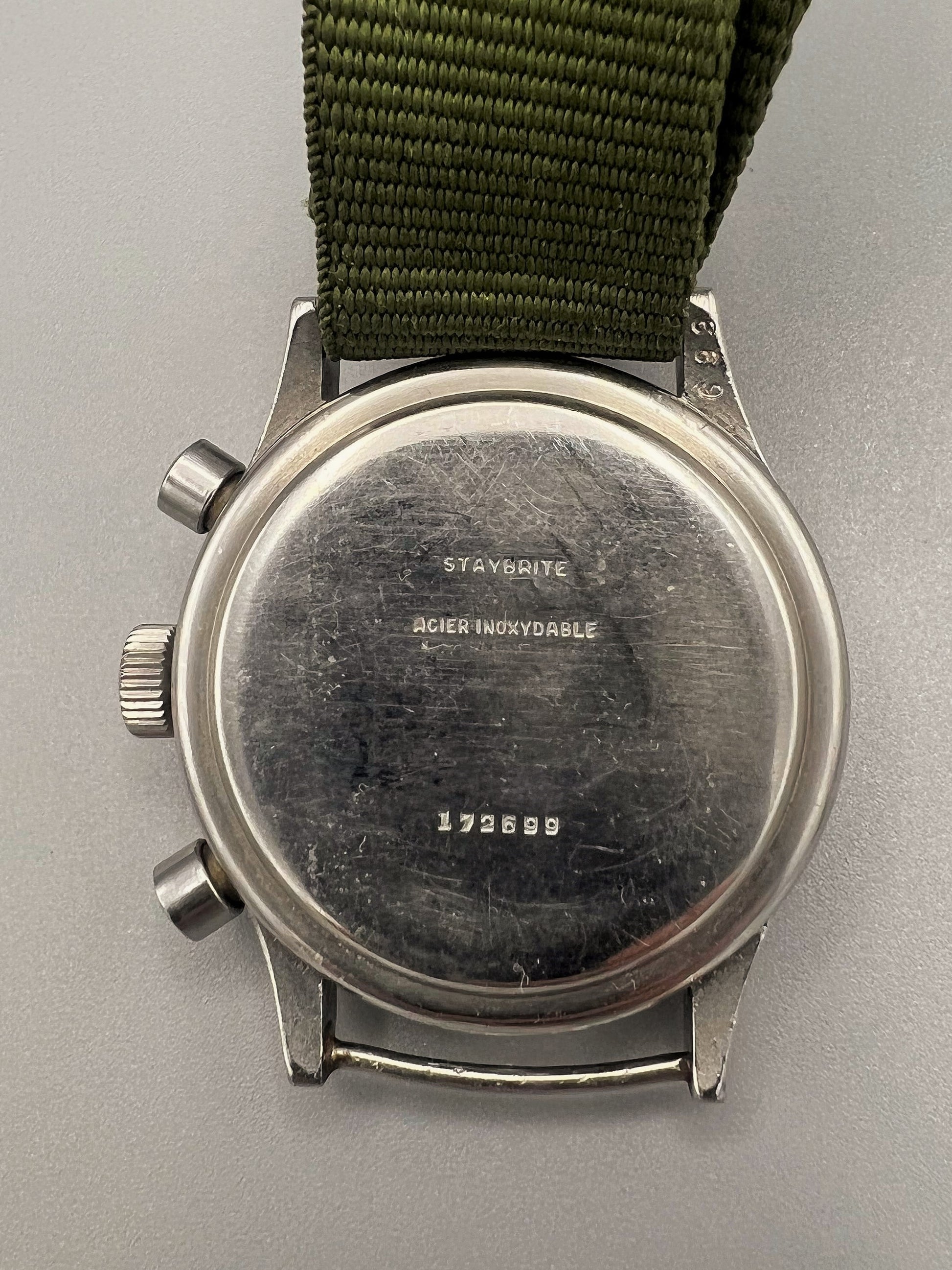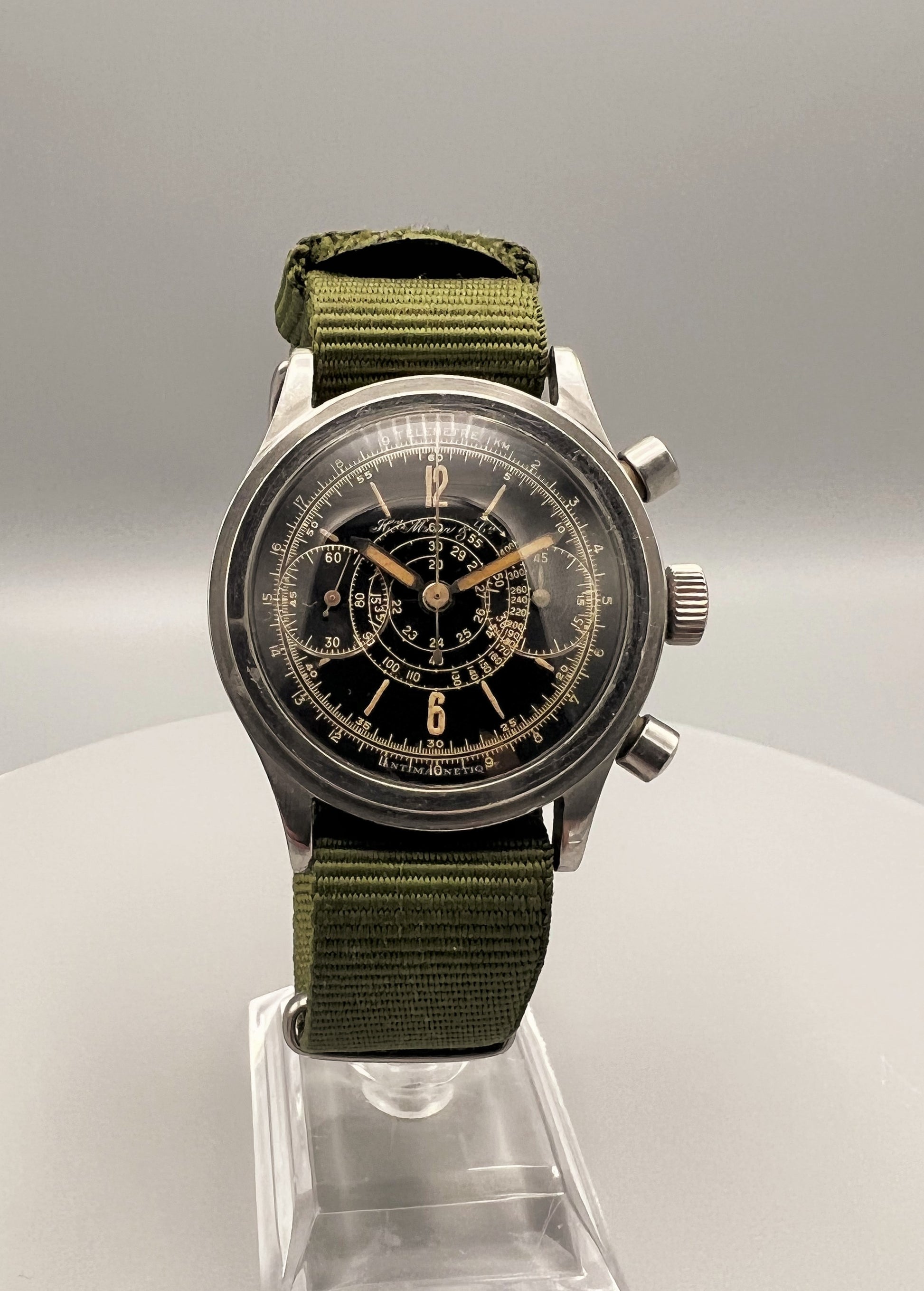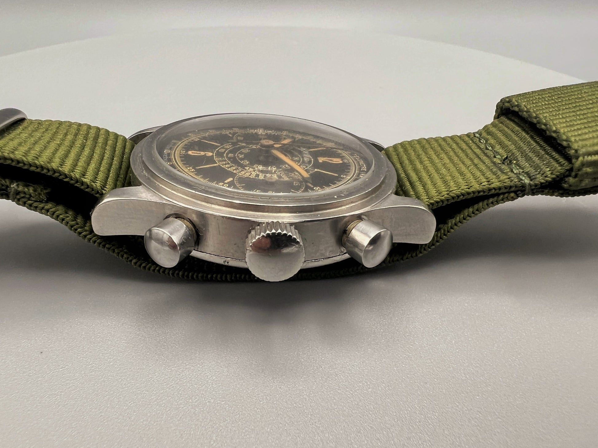 H. Moser & Cie, a very rare, oversized stainless steel chronograph, w/ black lacquer gilt printed dial, 1945
