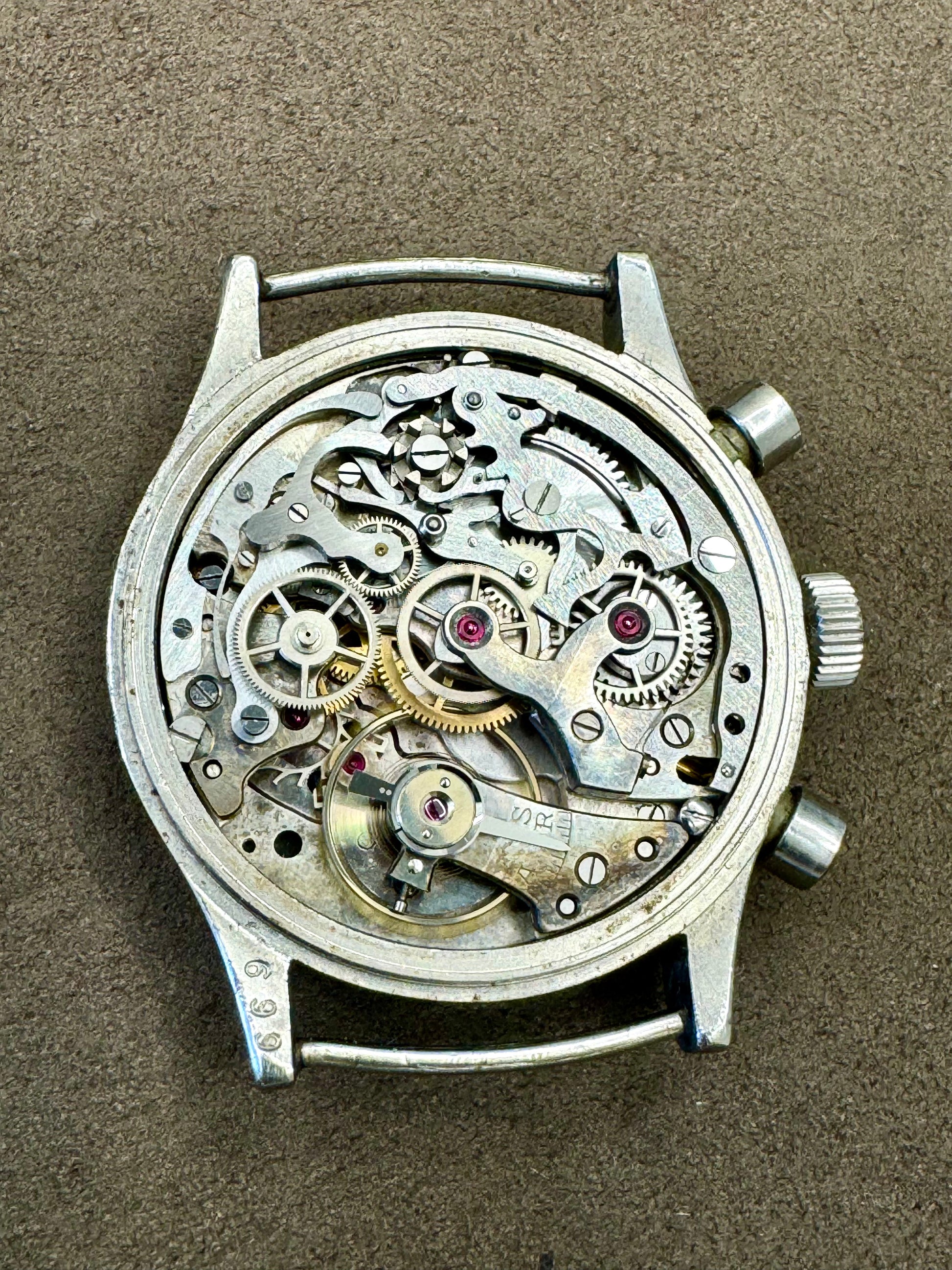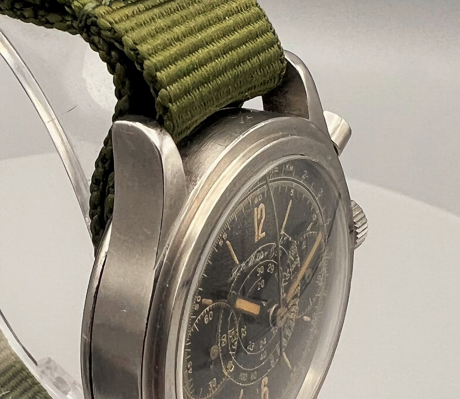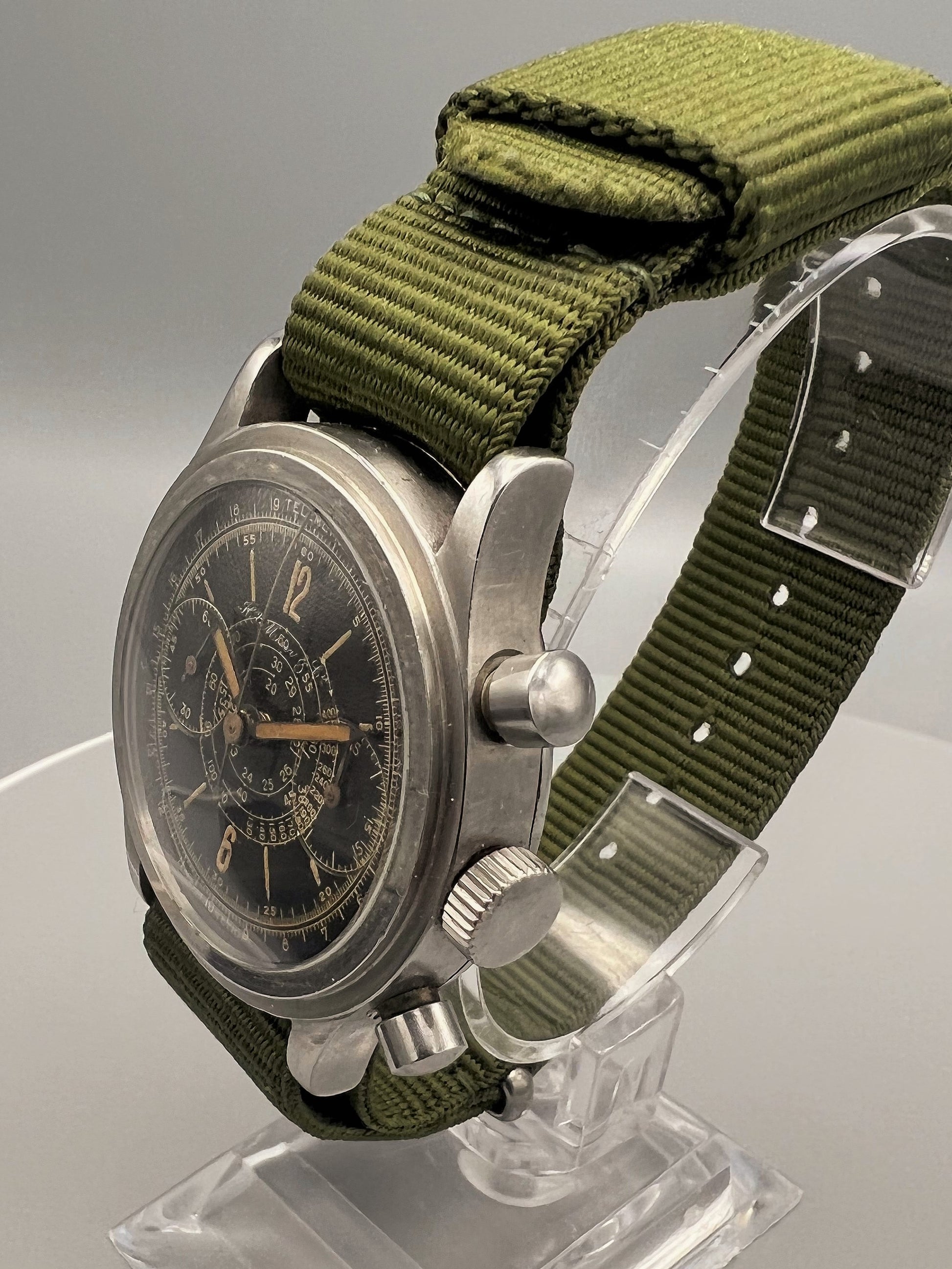 This timepiece is similar to, but in fact much rarer than the better known Longines "Tre Tacche" Cal 13zn of the same era.