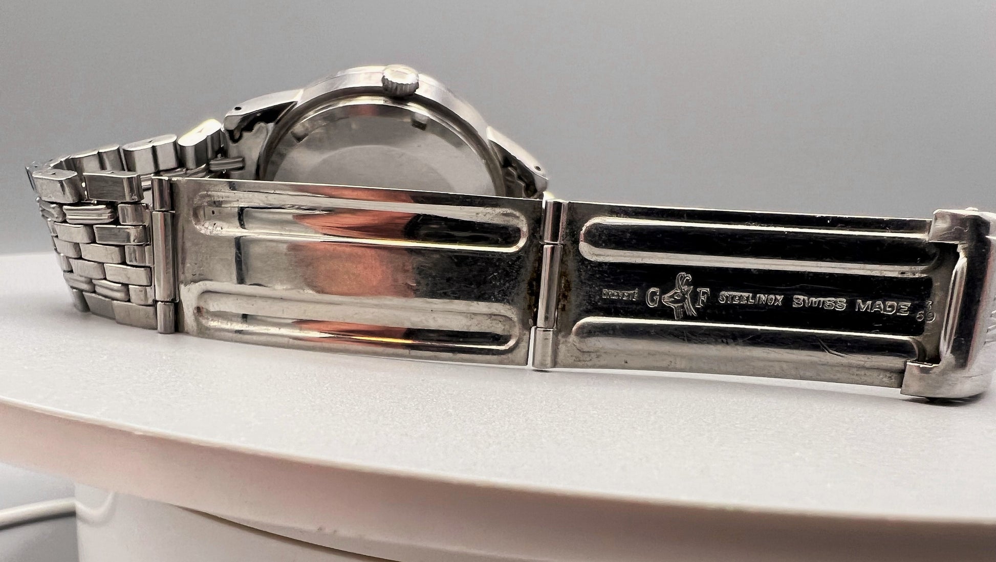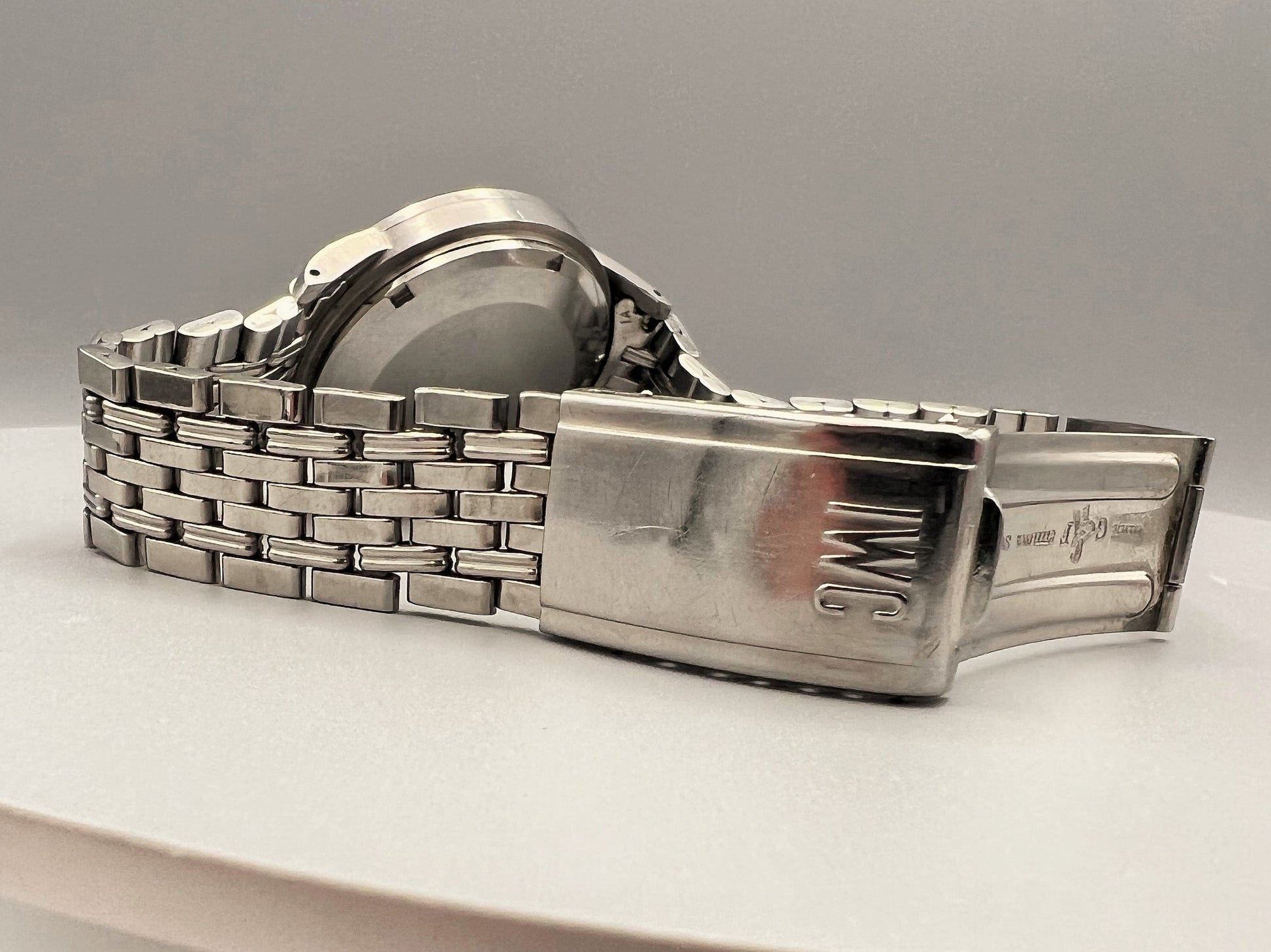 The Ingenieur ref 666 was mostly made with white dials and sometime in matte black. Our example with the glossy lacquer dial, silver galvanic gilt printing and blackout date is a rare and distinctive example. Furthermore the watch comes with the original IWC bracelet manufactured by Gay Frères.