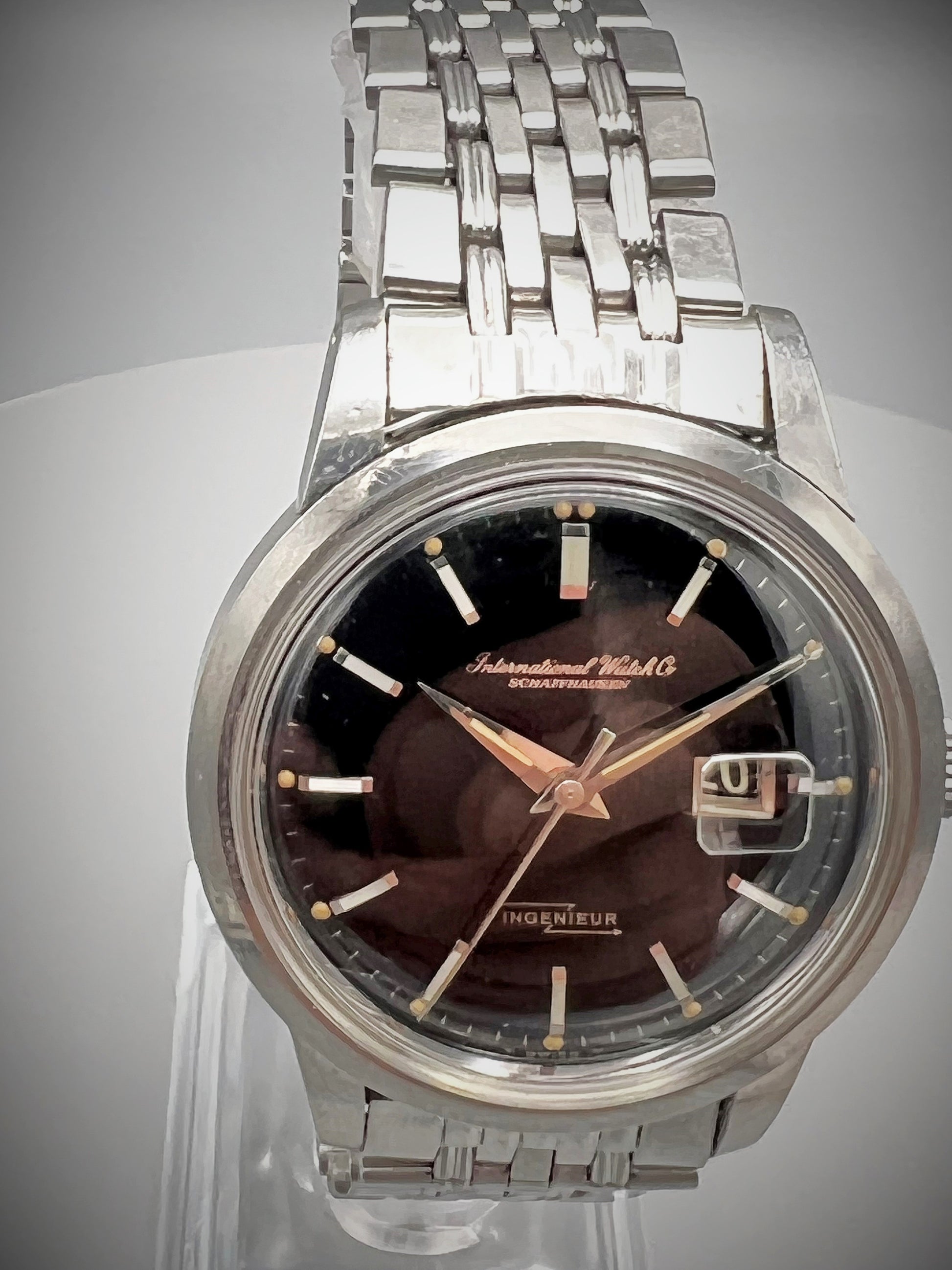 IWC Ingenieur Ref 666, rare stainless steel amagnetic watch with glossy gilt dial, blackout date, 1960