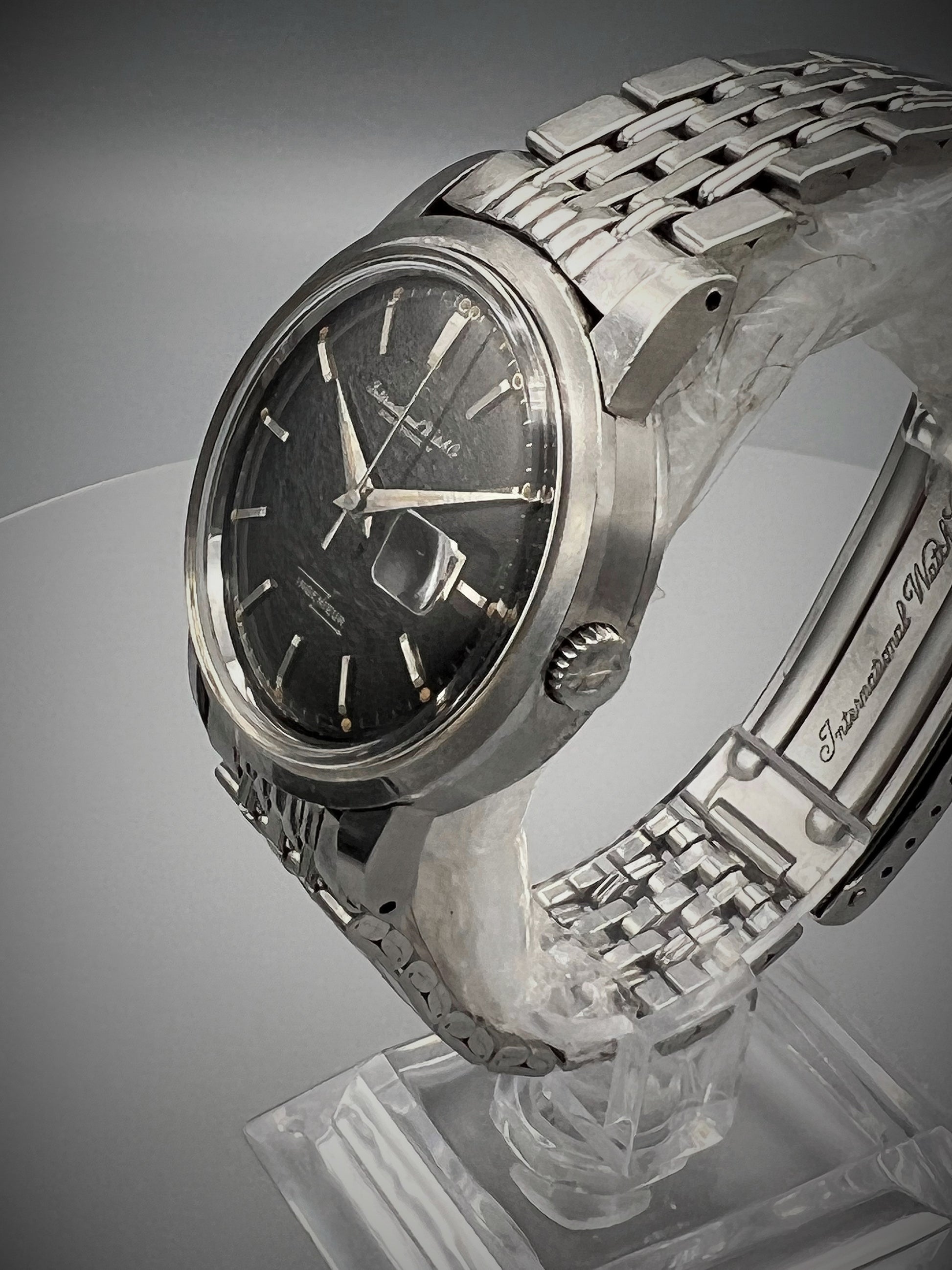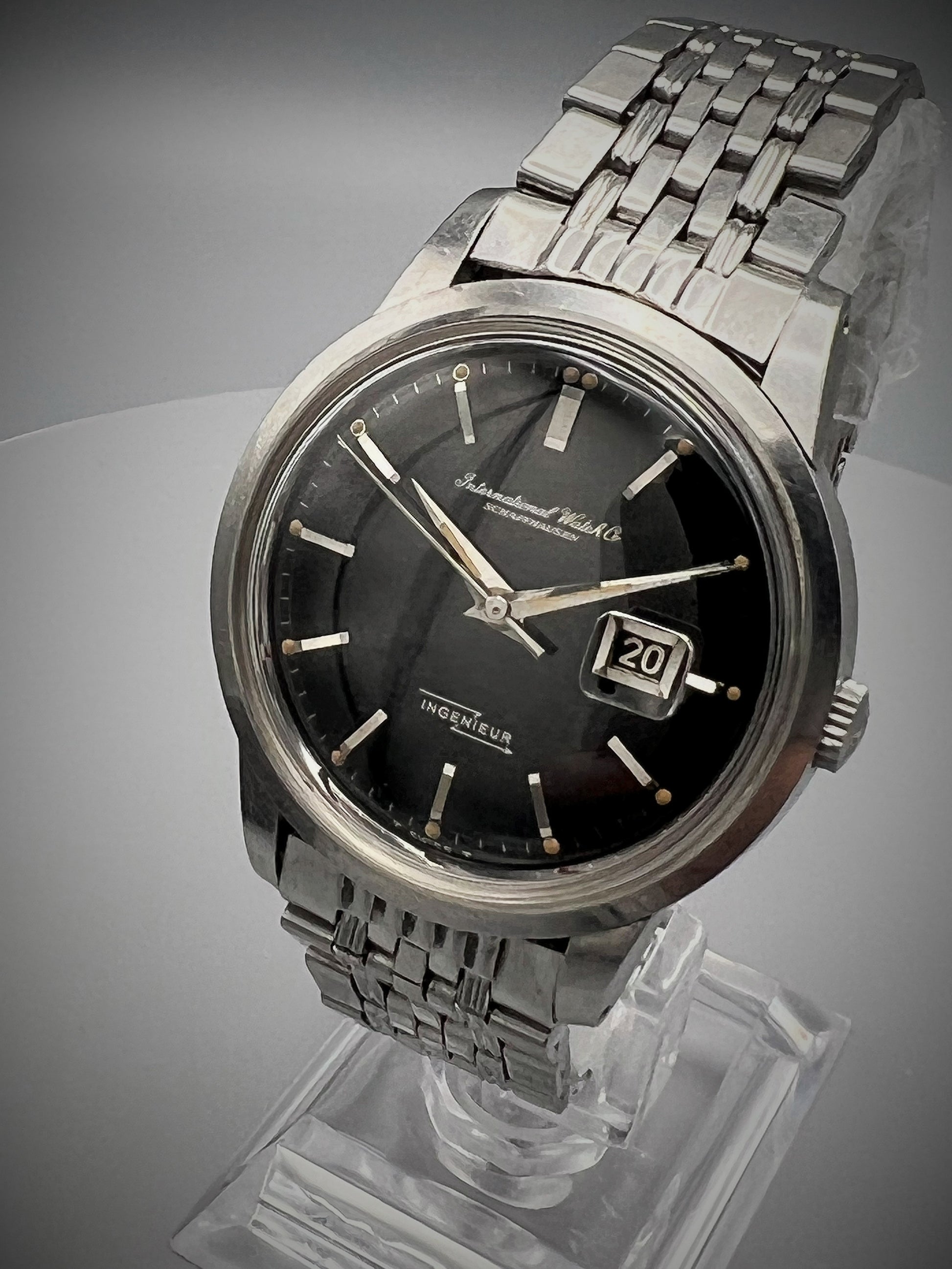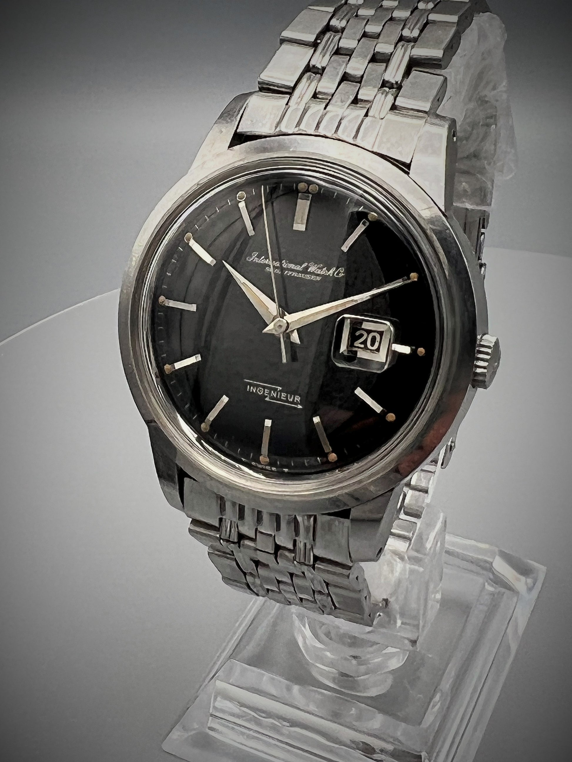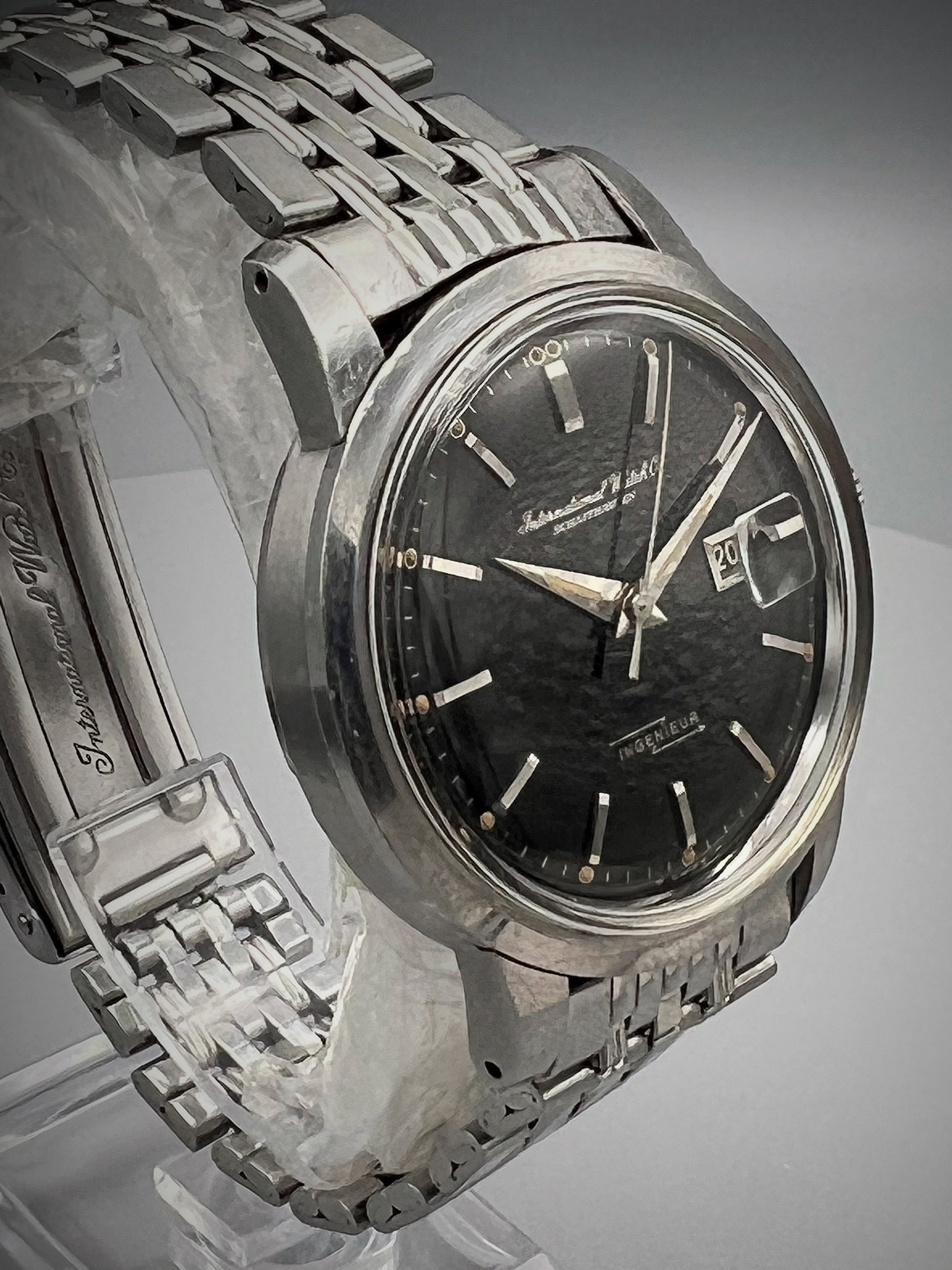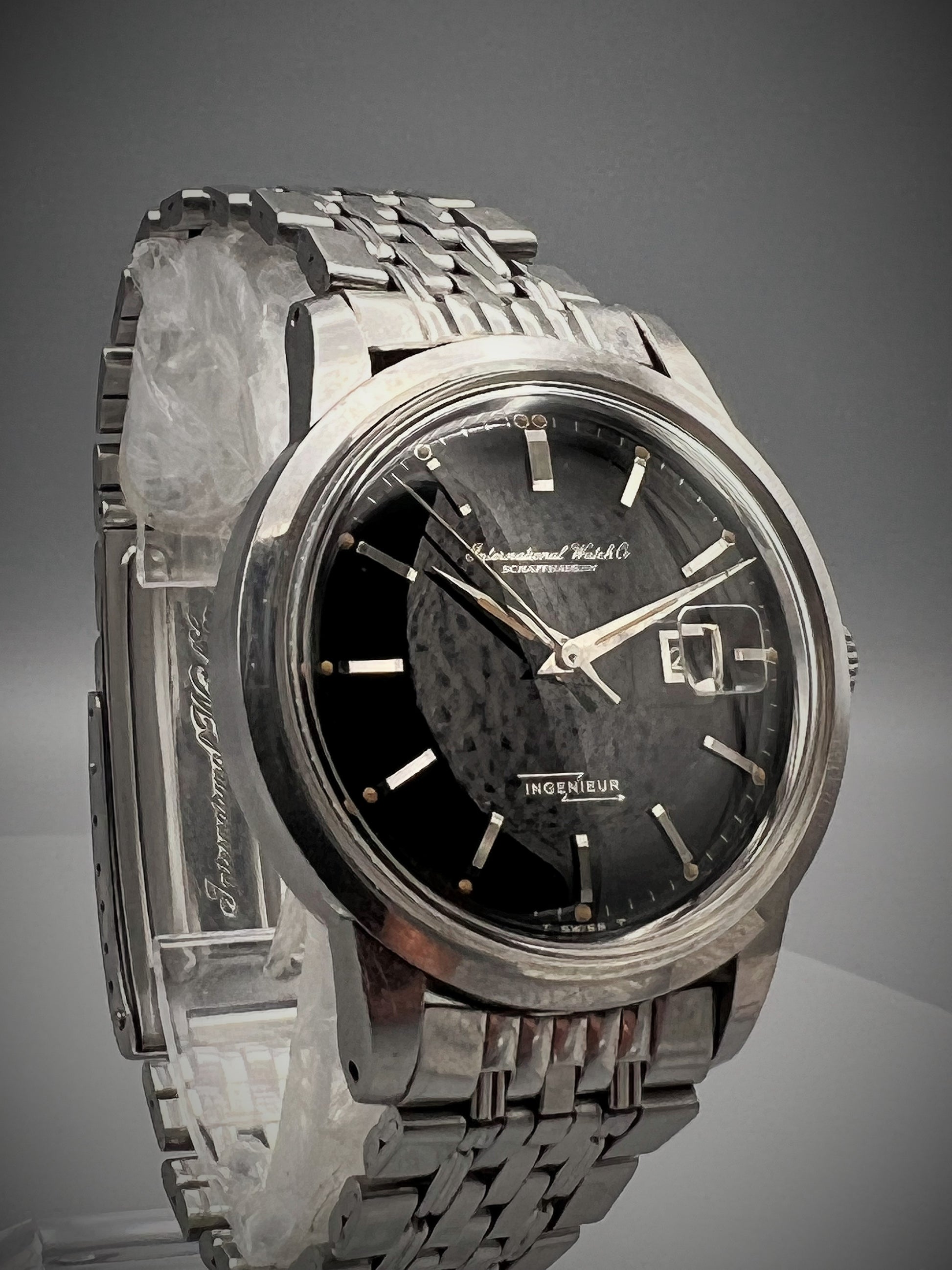 Considered one of the earliest "tool" watches and with its distinctive, timeless design, the early Ingenieur model enjoys cult status amongst collectors and this present example, with a distinctive black lacquered dial and galvanic printing, will certainly appeal to collectors. The watch was sold on April 3rd, 1963. The watch furthermore retains its IWC rice grains bracelet manufactured by Gay Frères, the master bracelet maker of the 20th century.