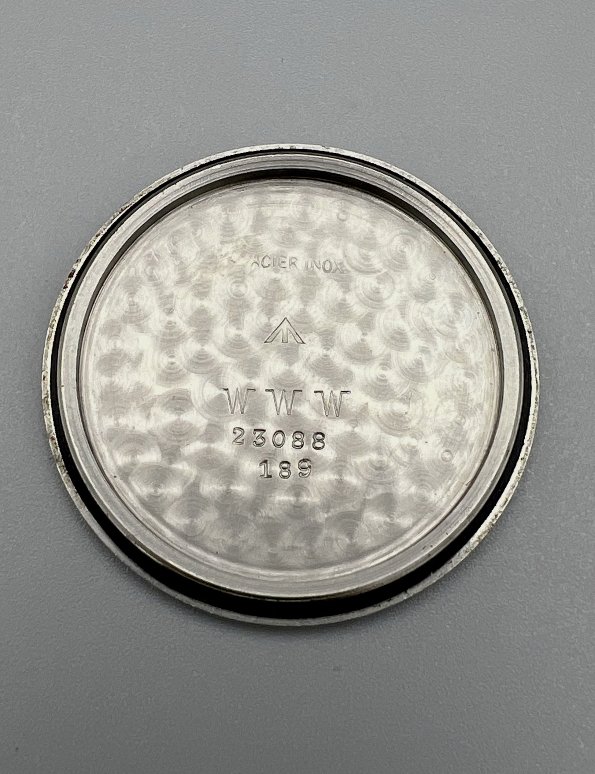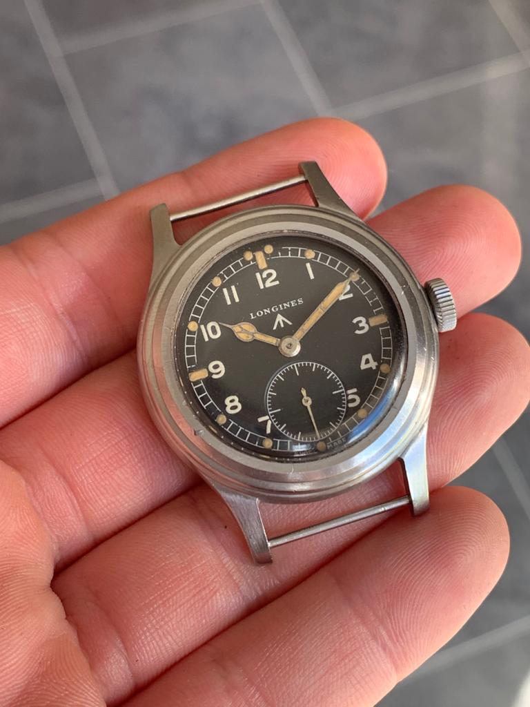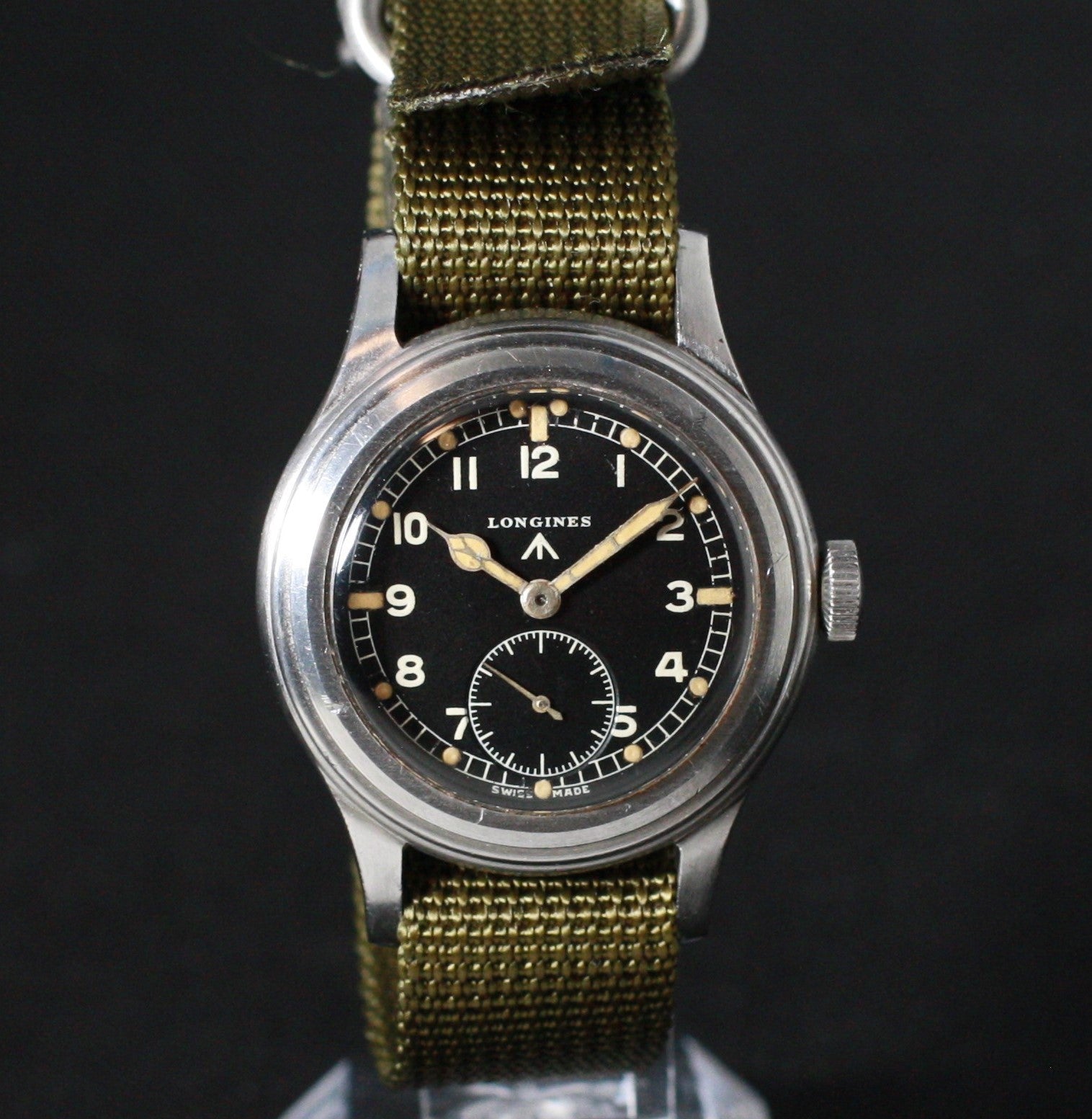 This in an original military issue watch, equipped with the Longines Caliber 12.68 Z gilt brass, Chronometer-grade manual movement, featuring: 15 Jewels, anti-shock, straight-line lever escapement, anti-magnetic monometallic balance, self-compensating Breguet hair spring, mircrometer regulator. Waterproof case number 3829.