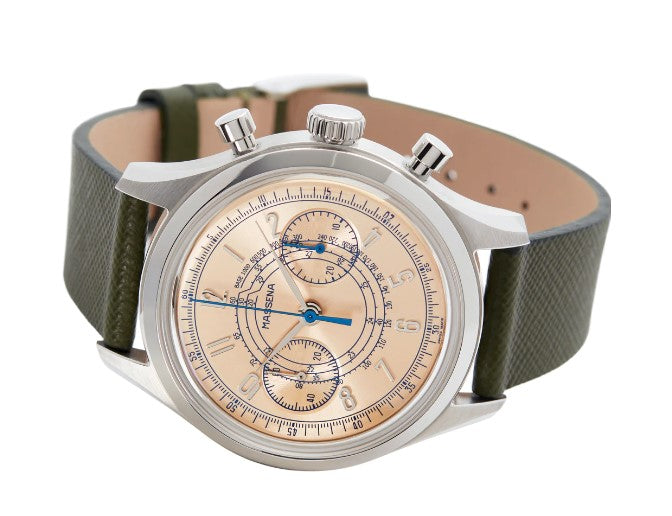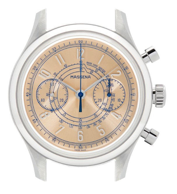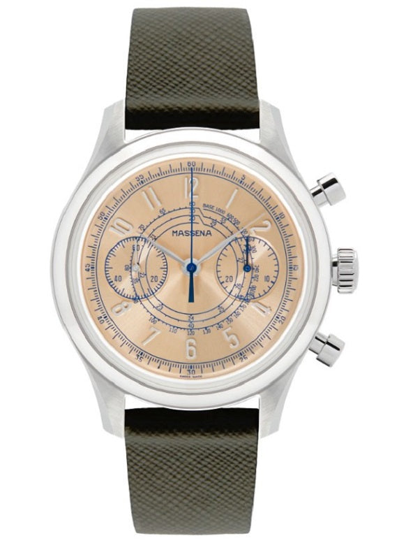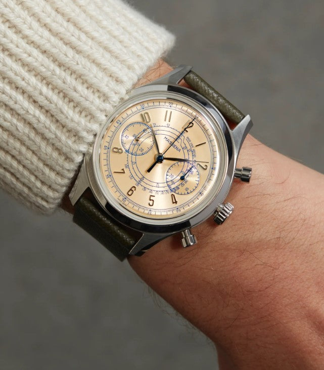 This is the Massena LAB Archetype 1.0. The watch is a friends-and-family-exclusive limited-edition of 50 chronograph with vintage styling and a stunning champagne dial. The Archetype 1.0 is the successor to the sold-out Archetype 0.0, also a vintage-inspired chronograph with a gilt dial released in 2021.