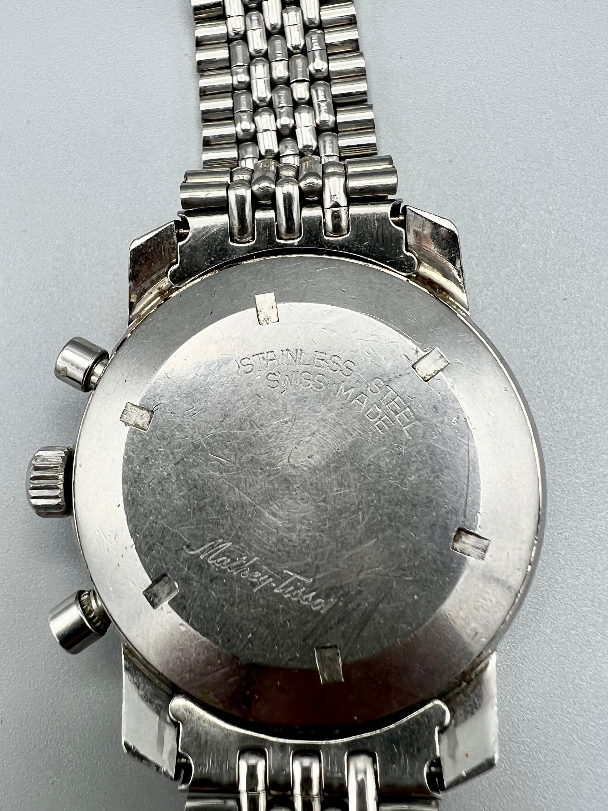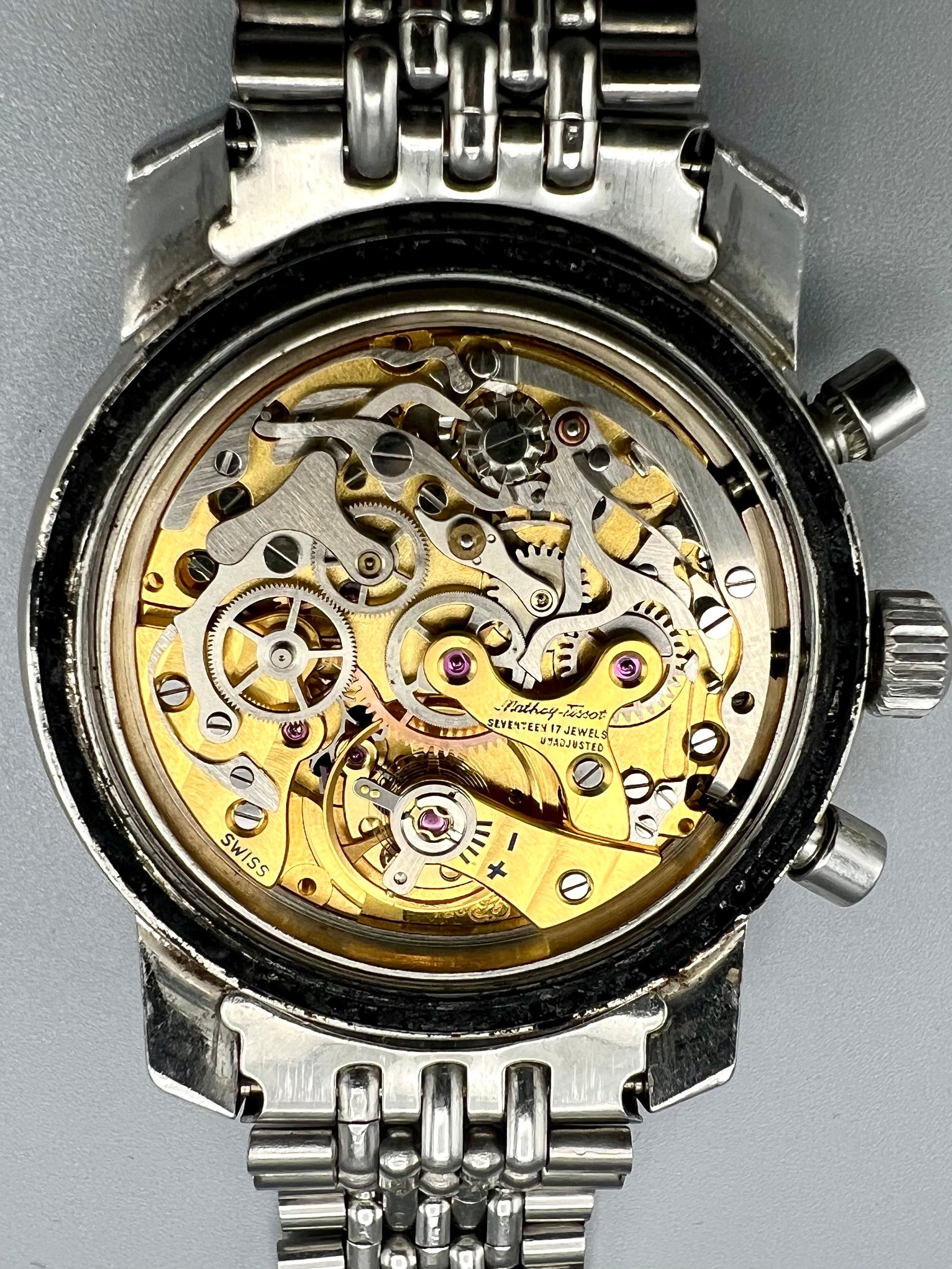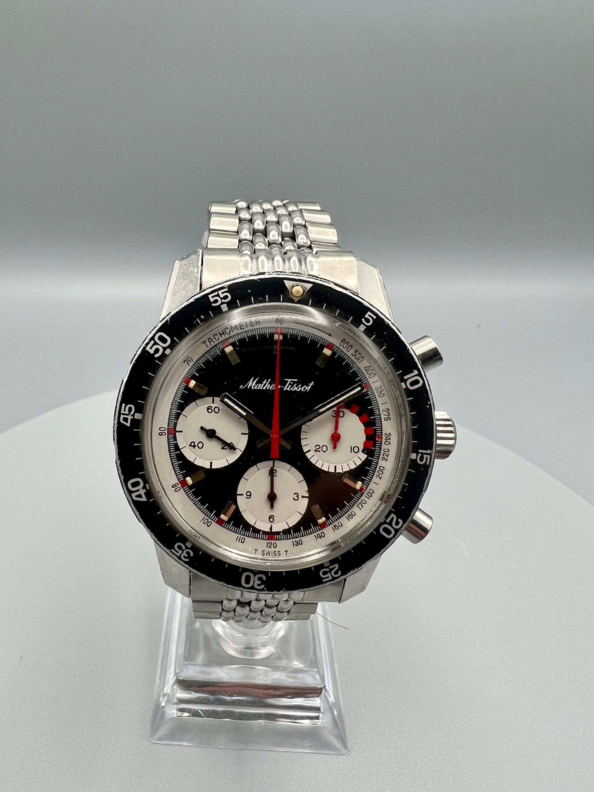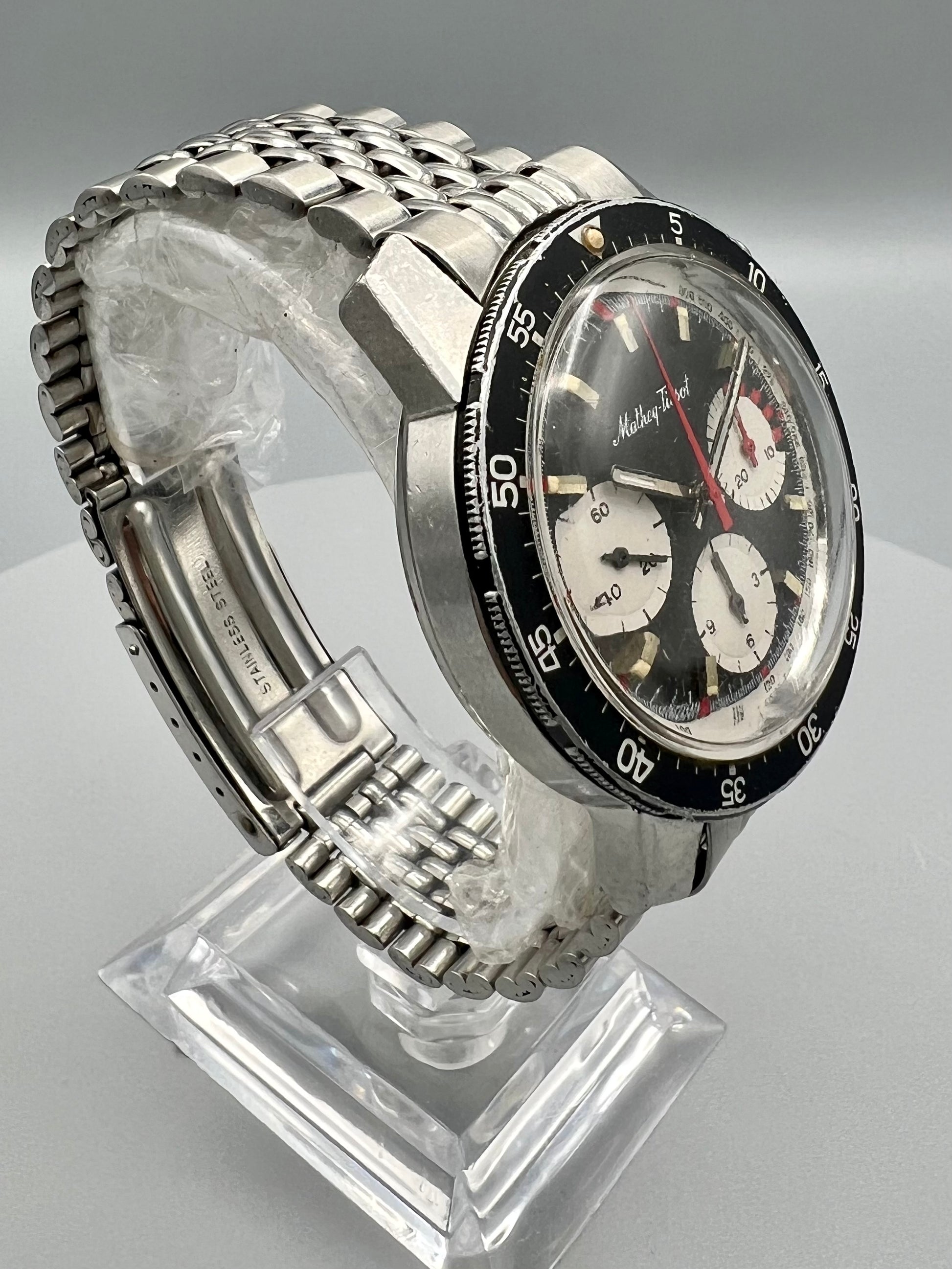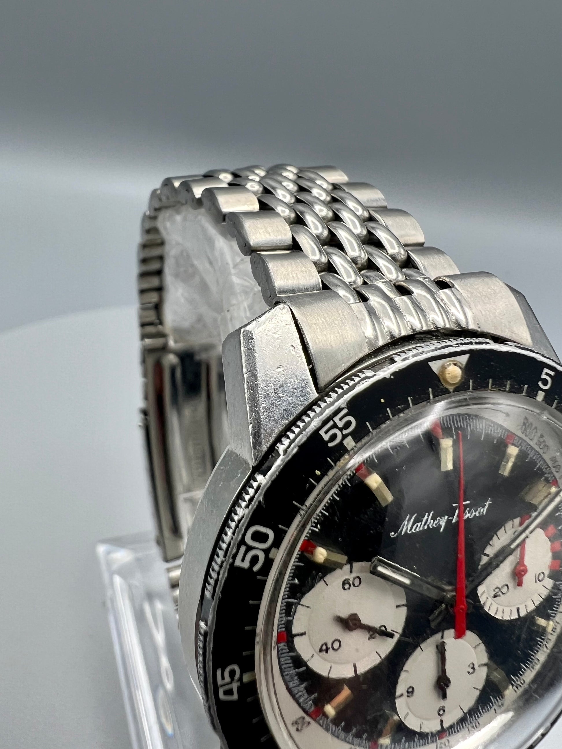 This very special Mathey-Tissot stainless steel chronograph – circa 1970 – is in excellent physical and mechanical condition. The case is almost definitely unpolished and shows only hairline scratches from normal wear. The dial and hands are original and well preserved, showing no oxidation. The bi-directional bezel (with the pearly dot intact) has faded to an appealing ghost-gray color with age. The original domed acrylic crystal is nearly perfect with a small and barely visible blemish at 1 o’clock – it should certainly not be touched, as it adds authenticity to the whole package.