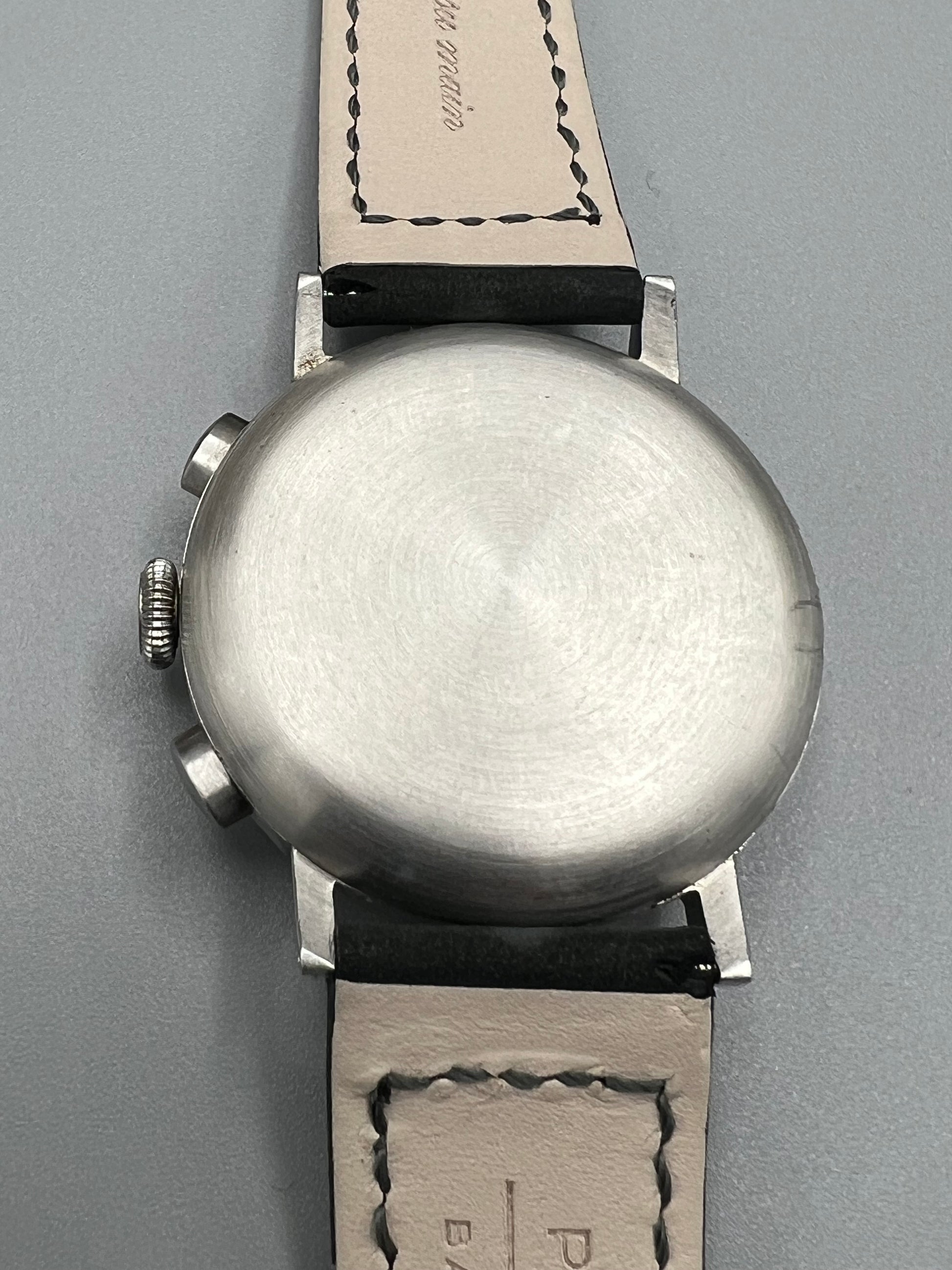 Dial: silvered, gilt Arabic numerals and dot markers. Outer meter is Telemeter scale in red and the blue scale is the Tachymeter. Leaf shaped blackened steel hands show no oxidation. Original and rare oval pushers activate the chronograph functions