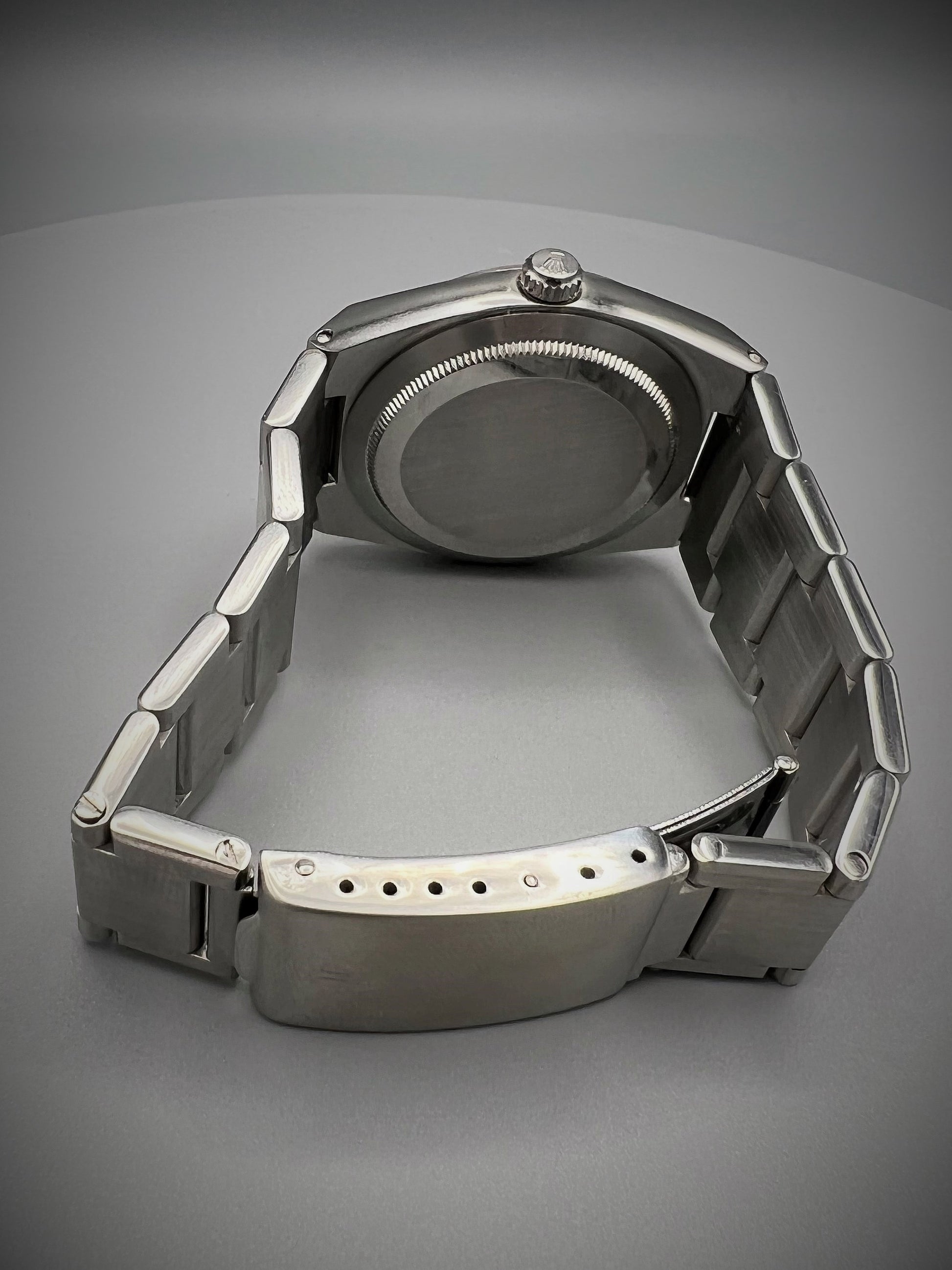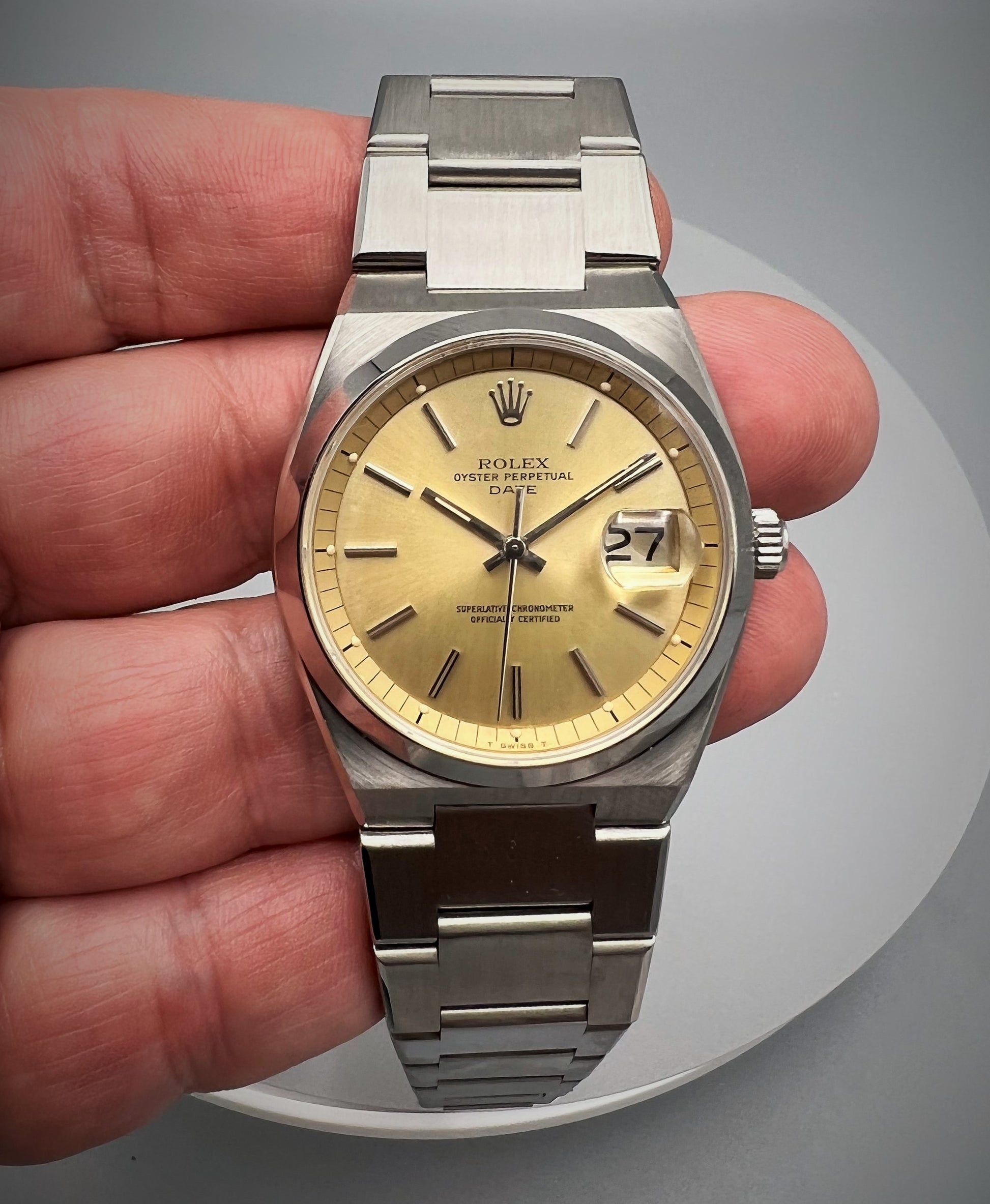 The dial of this Rolex Oyster Ref. 1530 is in exceptionally good condition, has a brushed silver finish, applied index markers, with classic 'ROLEX’ and ‘OYSTER PERPETUAL DATE' text referenced on it. The distinctive, angular case is sharply beveled, with diameter of 36mm. The large rehaut (with applied lume dots), conceals the depth at which the mechanical movement sits in the case, having originally been designed to house a thicker quartz calibre. It has its Rolex crown and comes equipped with its original, integrated Rolex bracelet and clasp (ref. 96660).