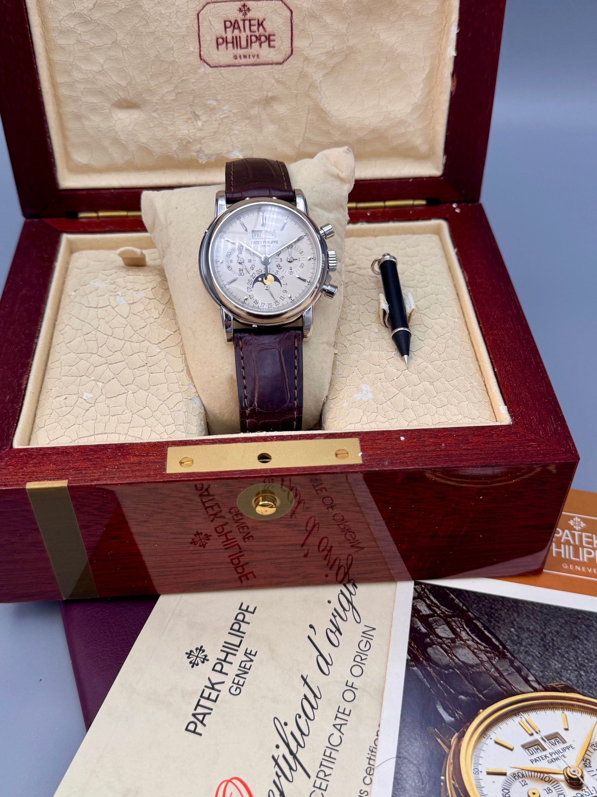 This is a rare transitional Ref. 3970E in platinum, featuring a chronograph, moon phases, 24-hour, and leap-year indications. Ref. 3970 was first introduced in 1986 and discontinued in 2004, undergoing three distinct transformations. It was replaced by the Ref. 5970, which carried forward the Lemania based chronograph with perpetual calendar in a slightly larger, updated case. The first series had a snap-on solid back, followed by the second series with a waterproof screw-in case back, alongside the short-lived Ref. 3971 with a glazed back. Finally, the third series consolidated the design with both solid and glazed backs.