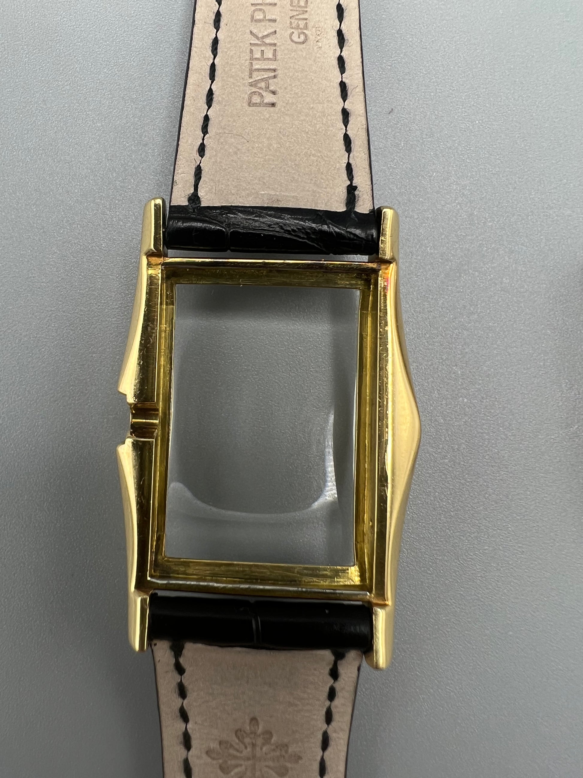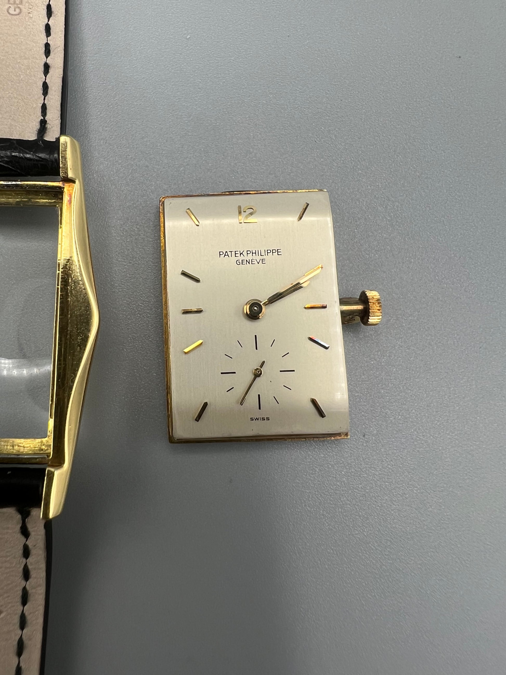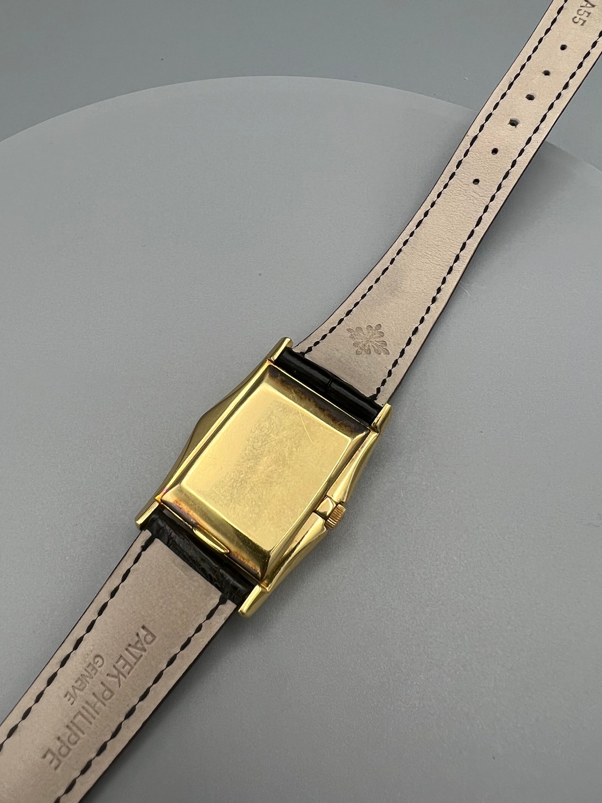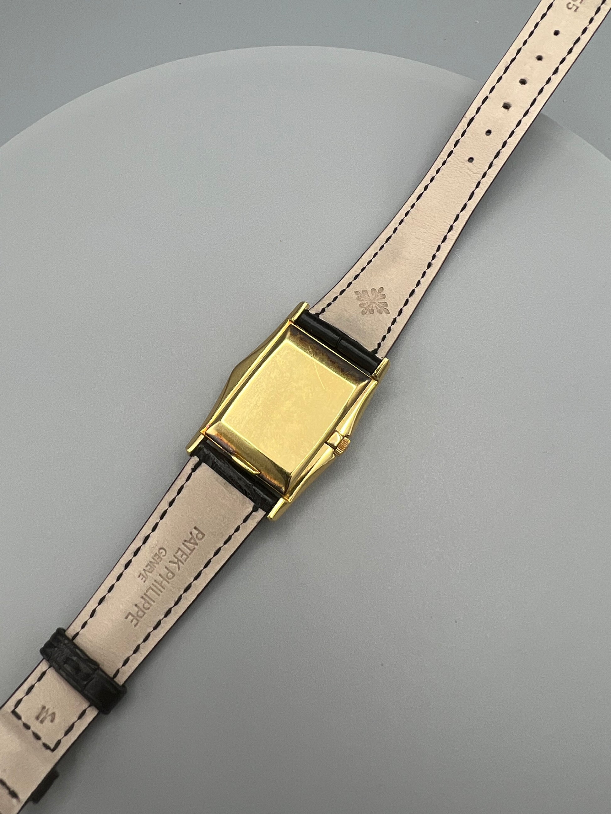 The present watch was stored in a safe and unworn for 20 years, developing a warm patina that ensconces the gold. The case is in excellent condition and only lightly polished in its lifetime – if at all – because it still retains sharp edges and a crisp hallmark found in between the lugs in the 6 o’clock position. We have examined the dial outside of the case and it is perfect, without any signs of age, and with raised enamel on the signature.