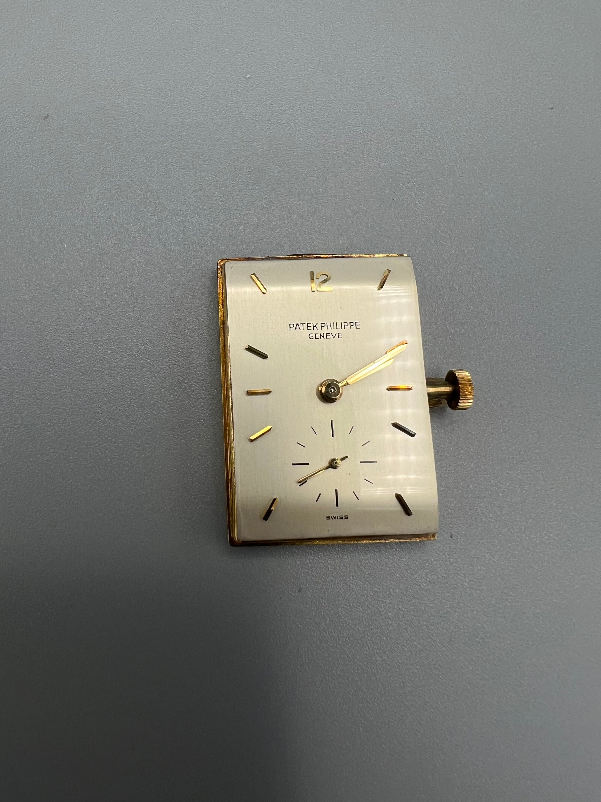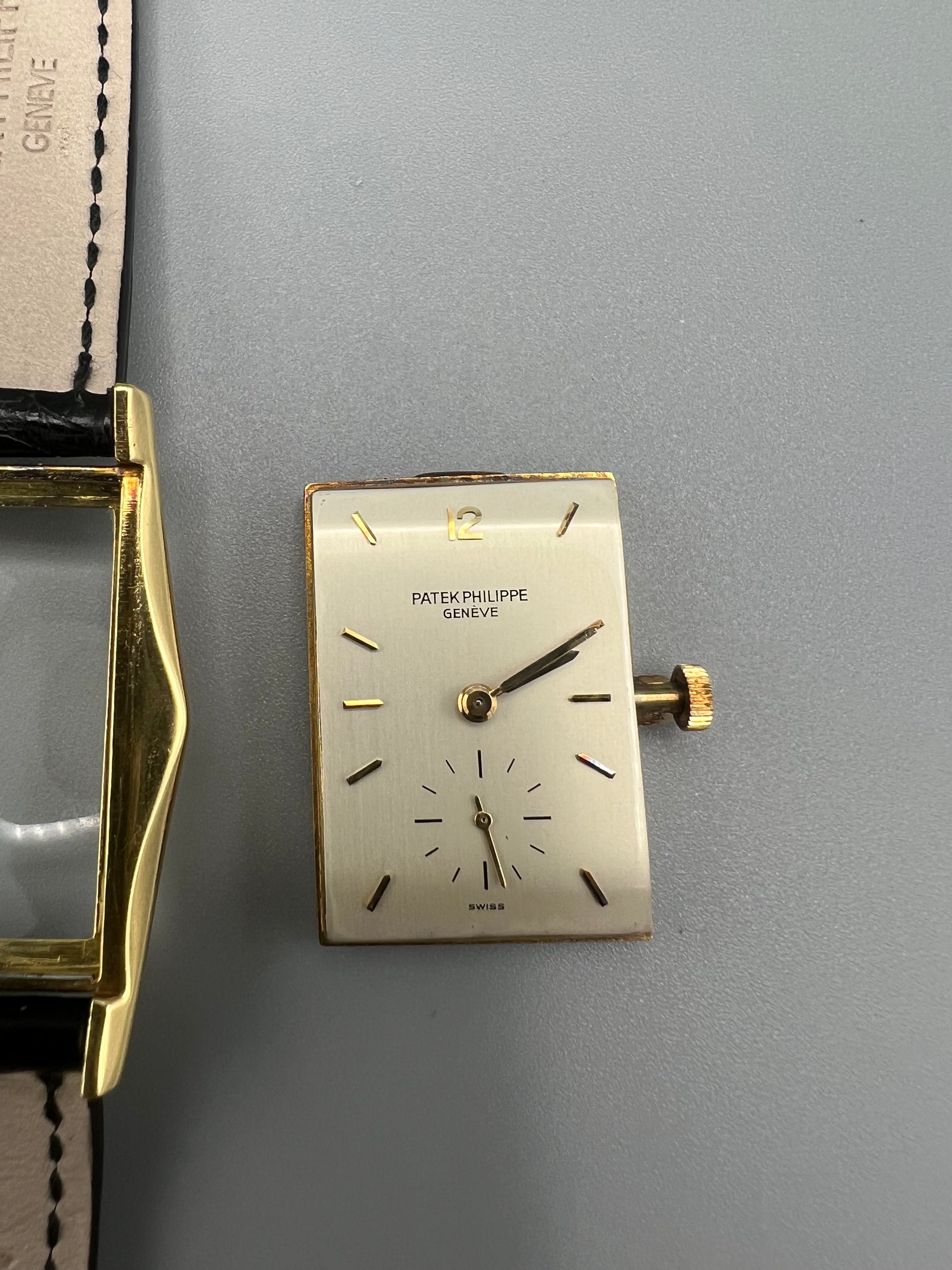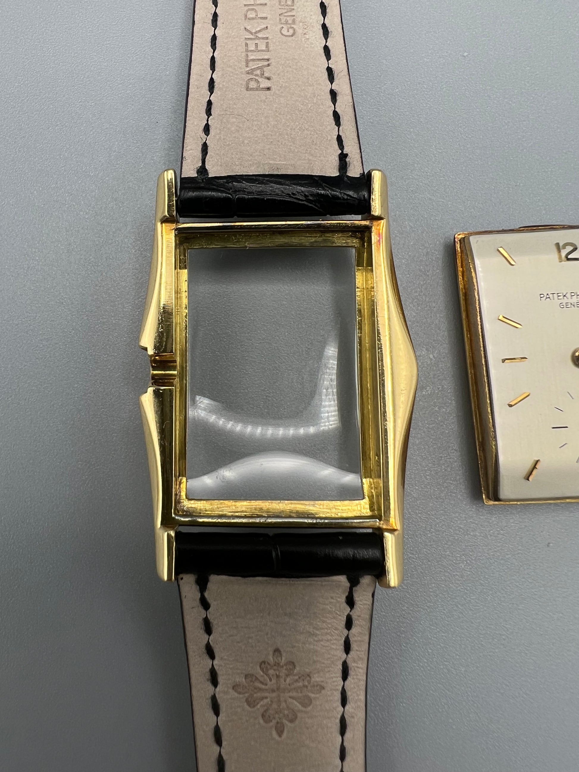 The present watch was stored in a safe and unworn for 20 years, developing a warm patina that ensconces the gold. The case is in excellent condition and only lightly polished in its lifetime – if at all – because it still retains sharp edges and a crisp hallmark found in between the lugs in the 6 o’clock position. We have examined the dial outside of the case and it is perfect, without any signs of age, and with raised enamel on the signature.