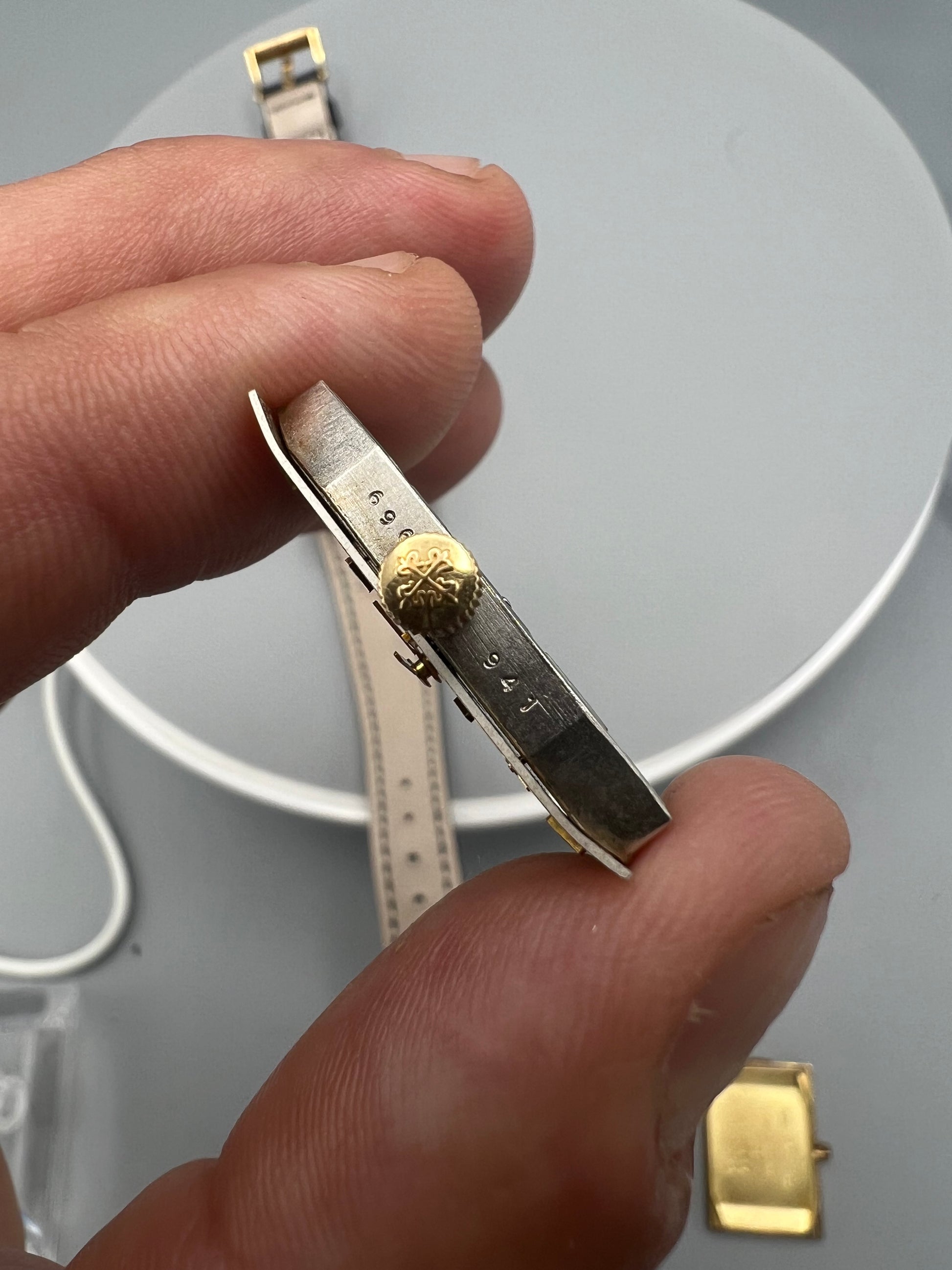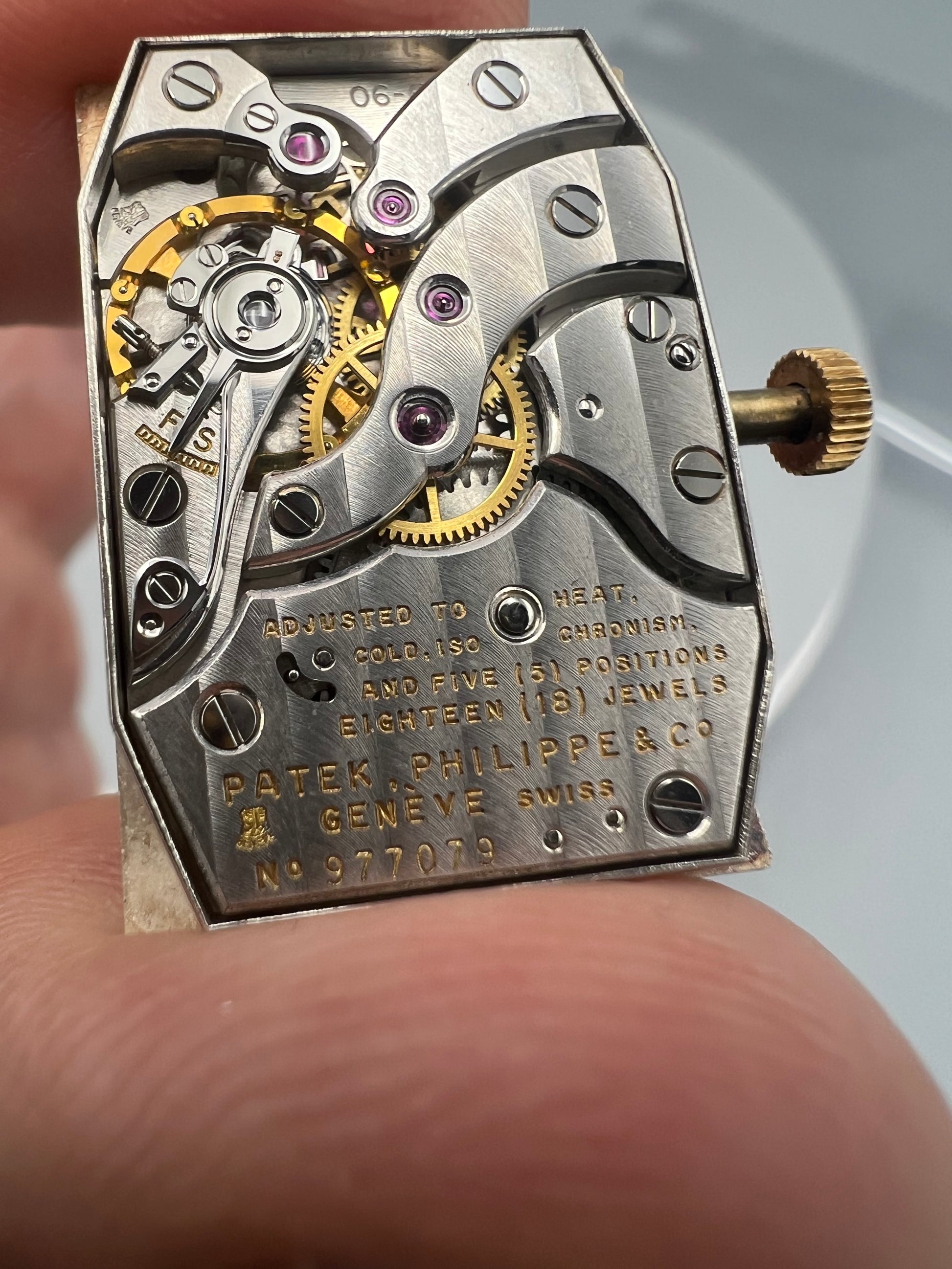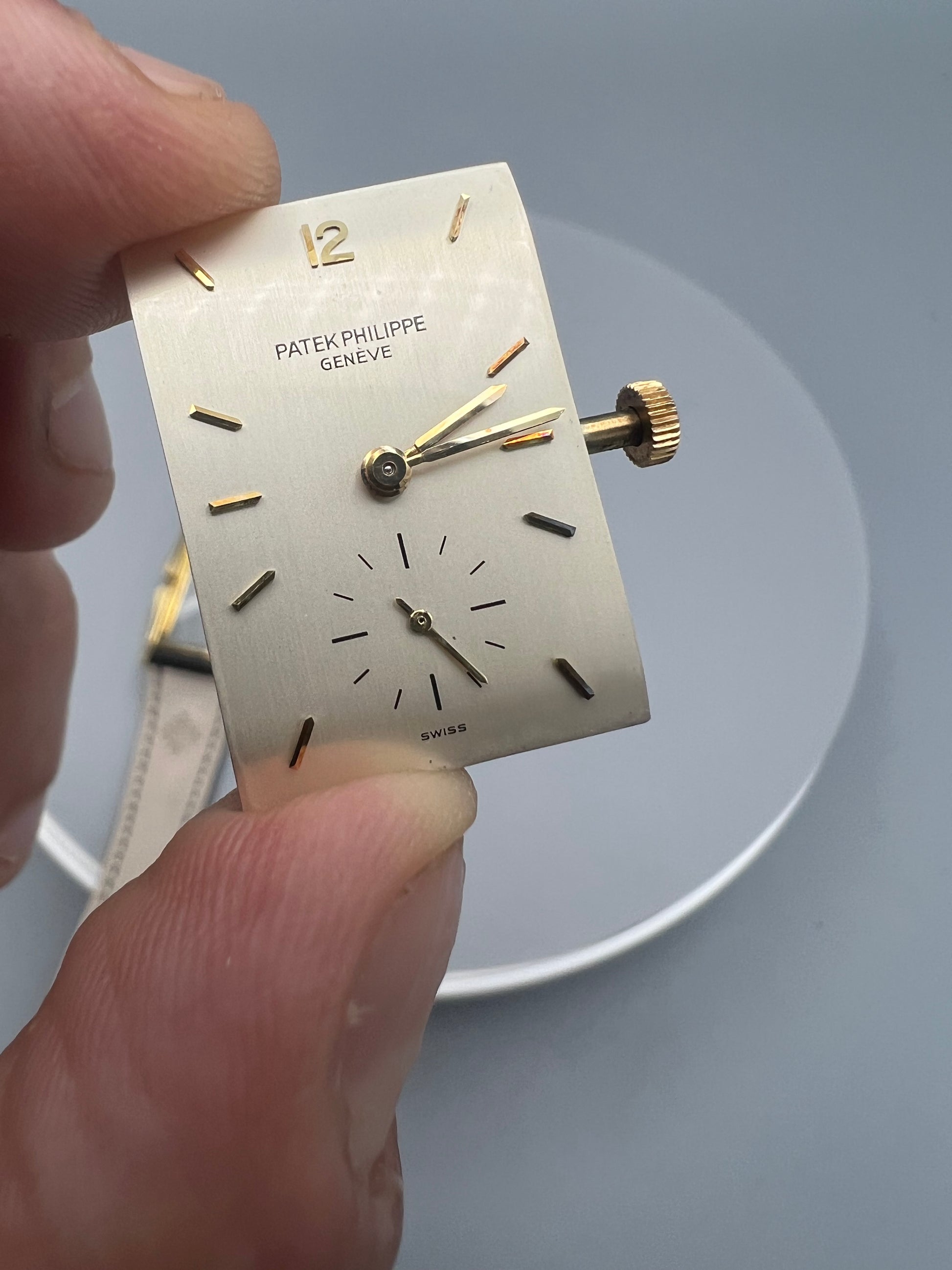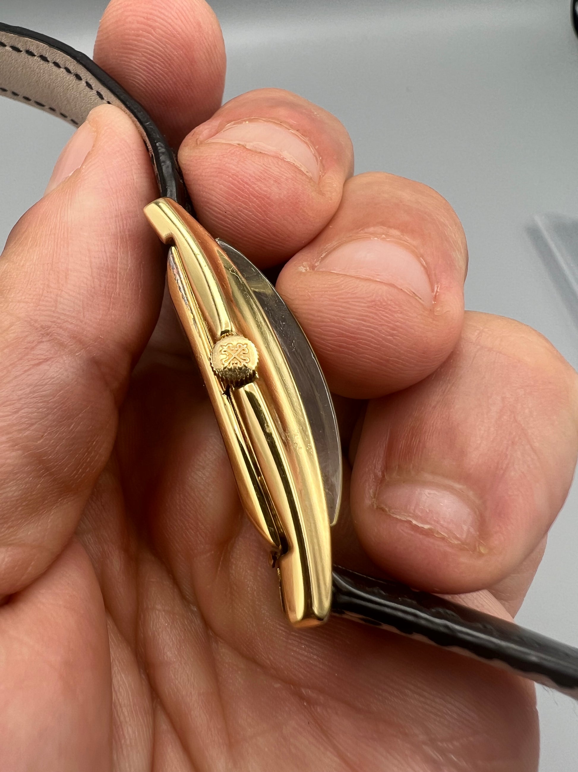 The present watch was stored in a safe and unworn for 20 years, developing a warm patina that ensconces the gold. The case is in excellent condition and only lightly polished in its lifetime – if at all – because it still retains sharp edges and a crisp hallmark found in between the lugs in the 6 o’clock position. We have examined the dial outside of the case and it is perfect, without any signs of age, and with raised enamel on the signature.