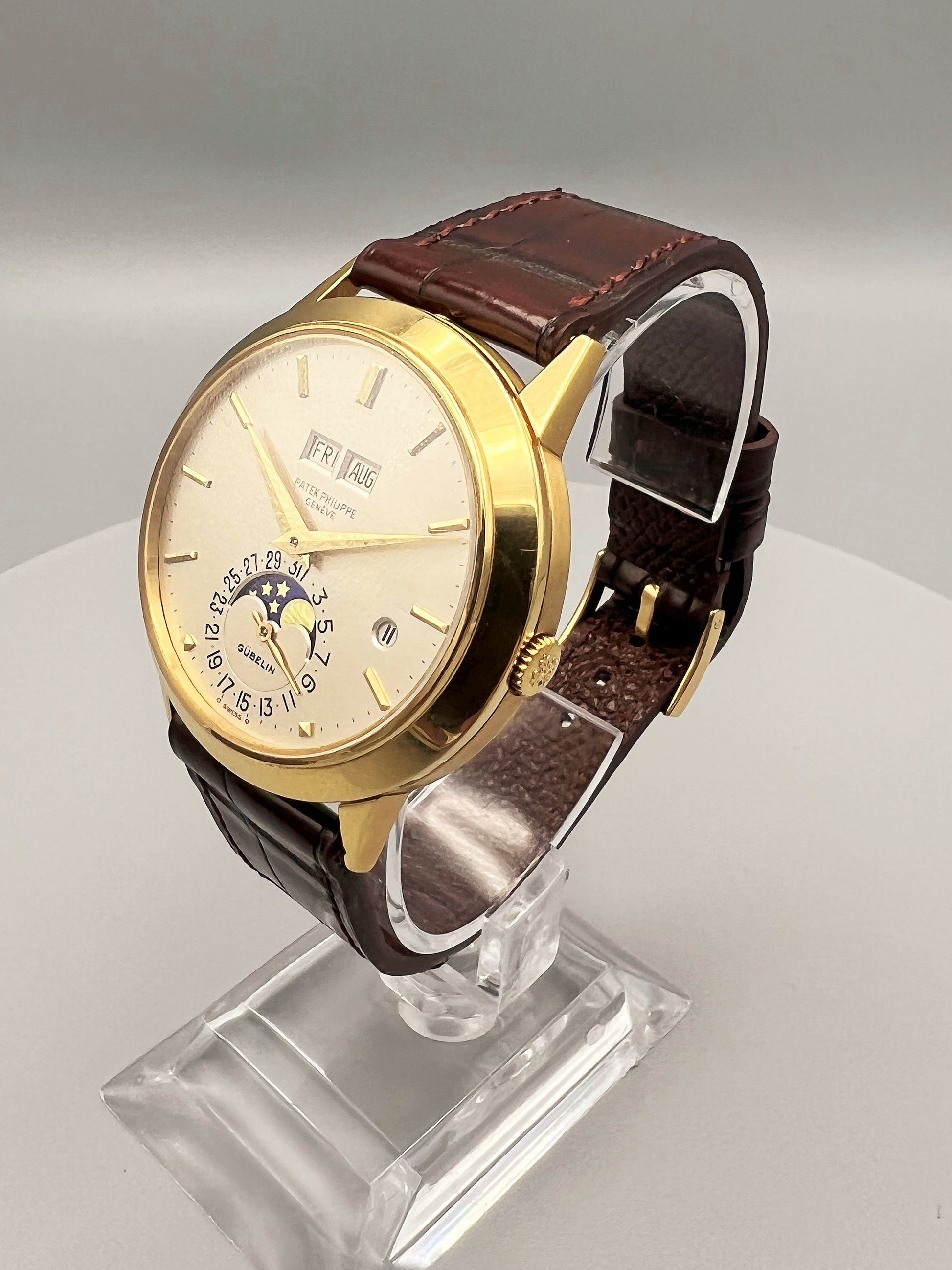 Patek perpetual calendar watches date to the 1920s, but Ref 3450 was the first Patek Philippe with a leap year indicator window. It was introduced in in 1981 as an upgrade to Ref 3448. This ref. 3450 is not only important as the link between Patek Philippe's vintage perpetual calendar models to their modern references, it is also exceptionally rare. Throughout its five-year production run lasting until 1985, only a total of 244 examples were produced,. The one we have featured here is further distinguished for its rarity because of the Gubelin prestige retailer signature on the dial.