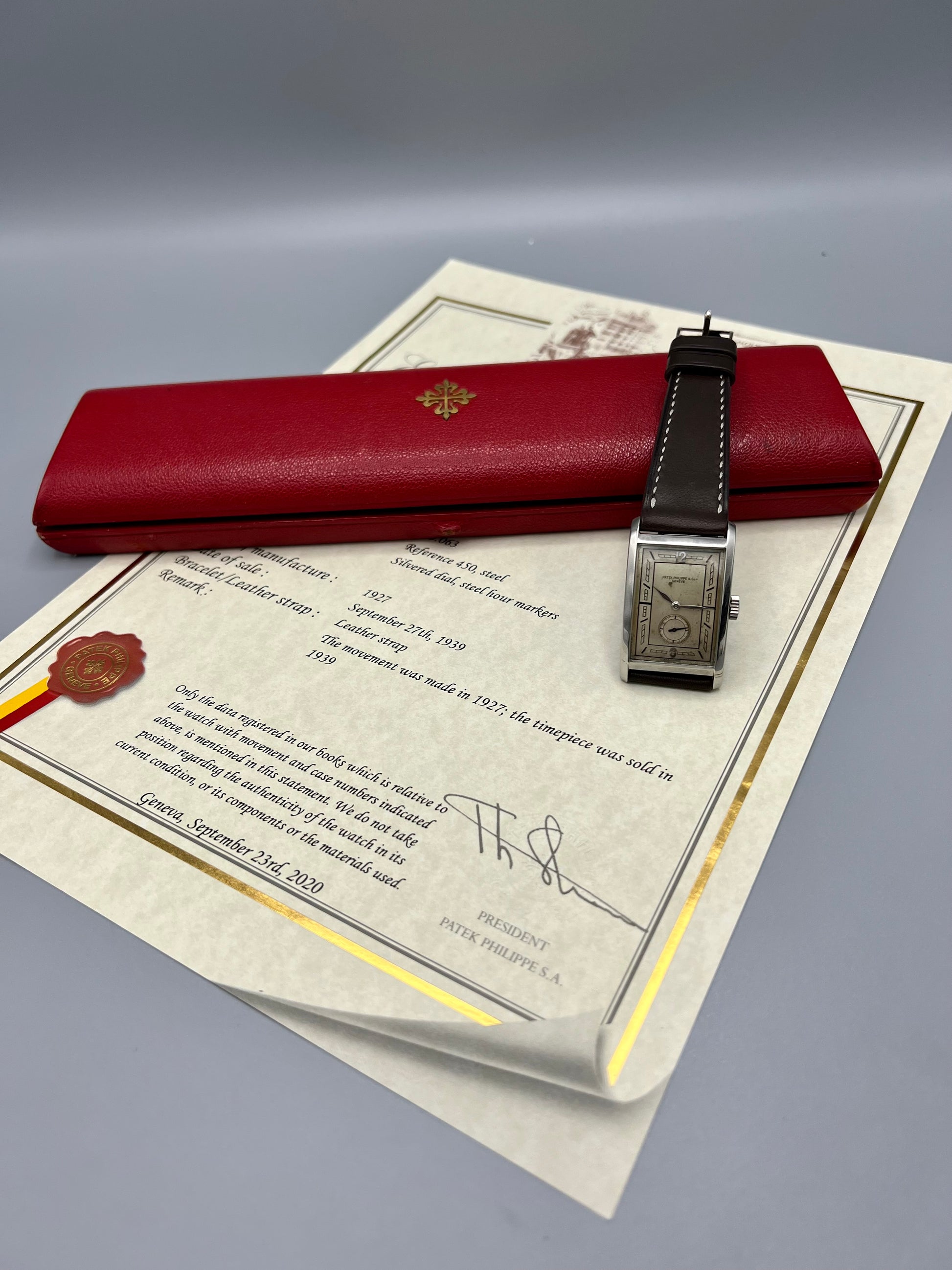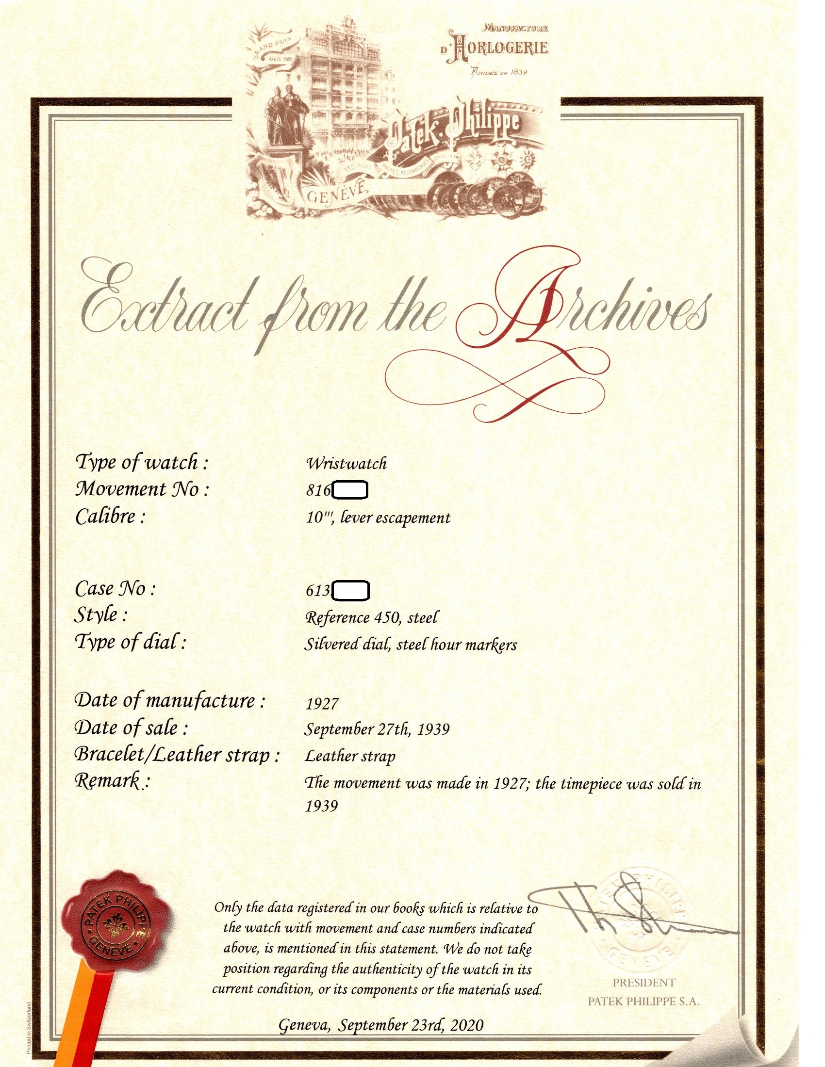 This Patek comes with an Extract from the Archives, confirming the production of this watch in 1927. The watch is further accompanied by a vintage Patek Philippe box. Dial, case and movement signed.
