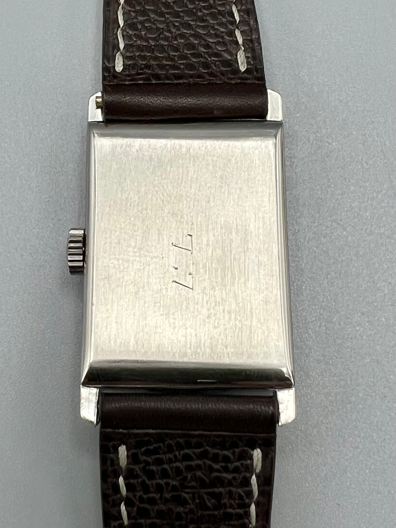 One remarkable feature of the watch is the size of the case which is quite large for the period before the 1950s when watches became more flamboyant. The watch is 42 mm from lug to lug and features a curved case design and snap back case closure. The curved crystal follows the shape of the watch and is in excellent condition.