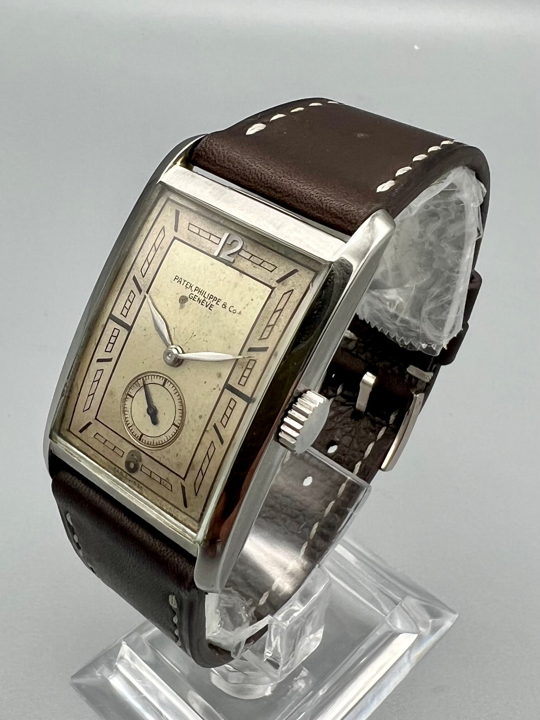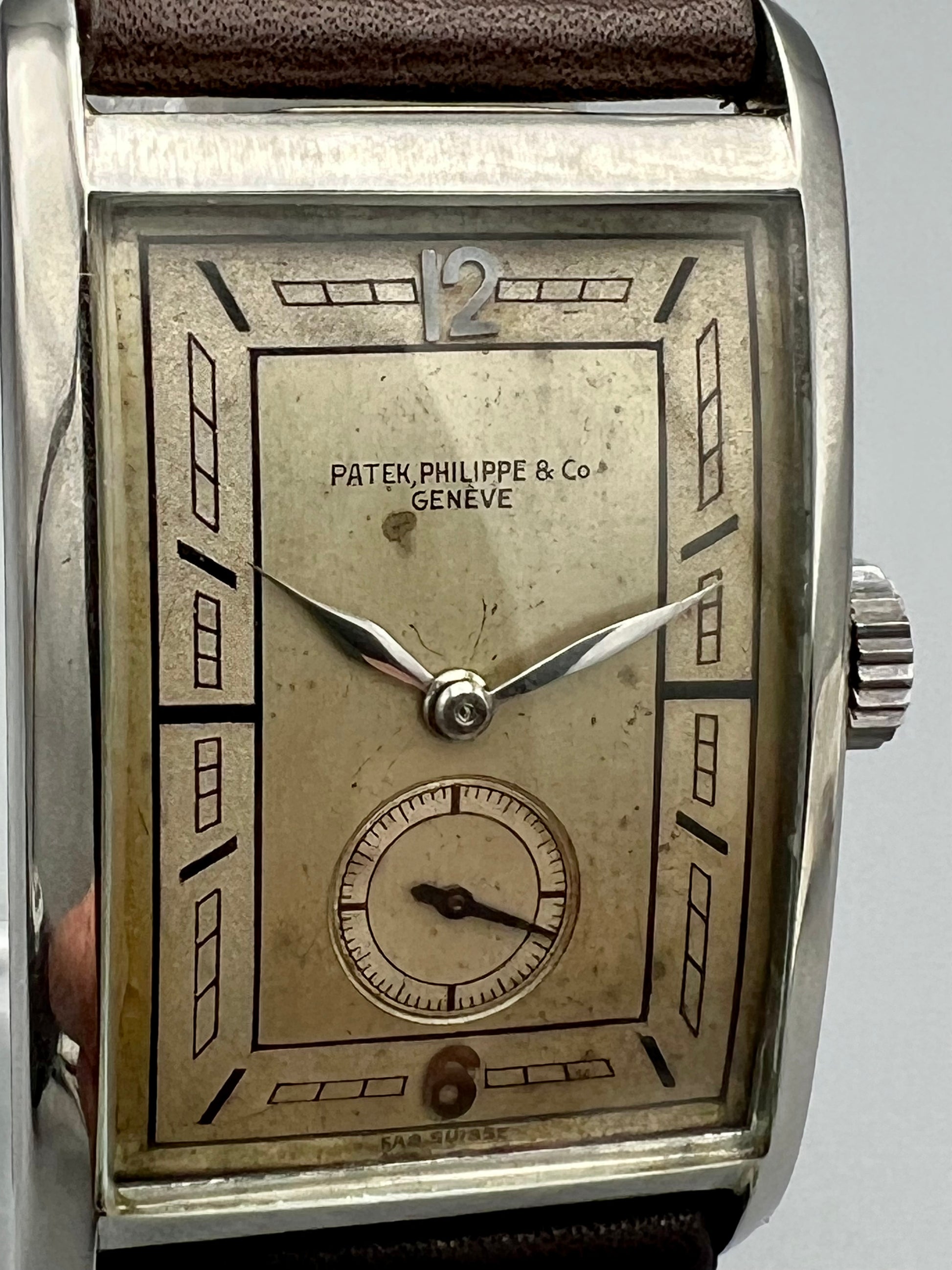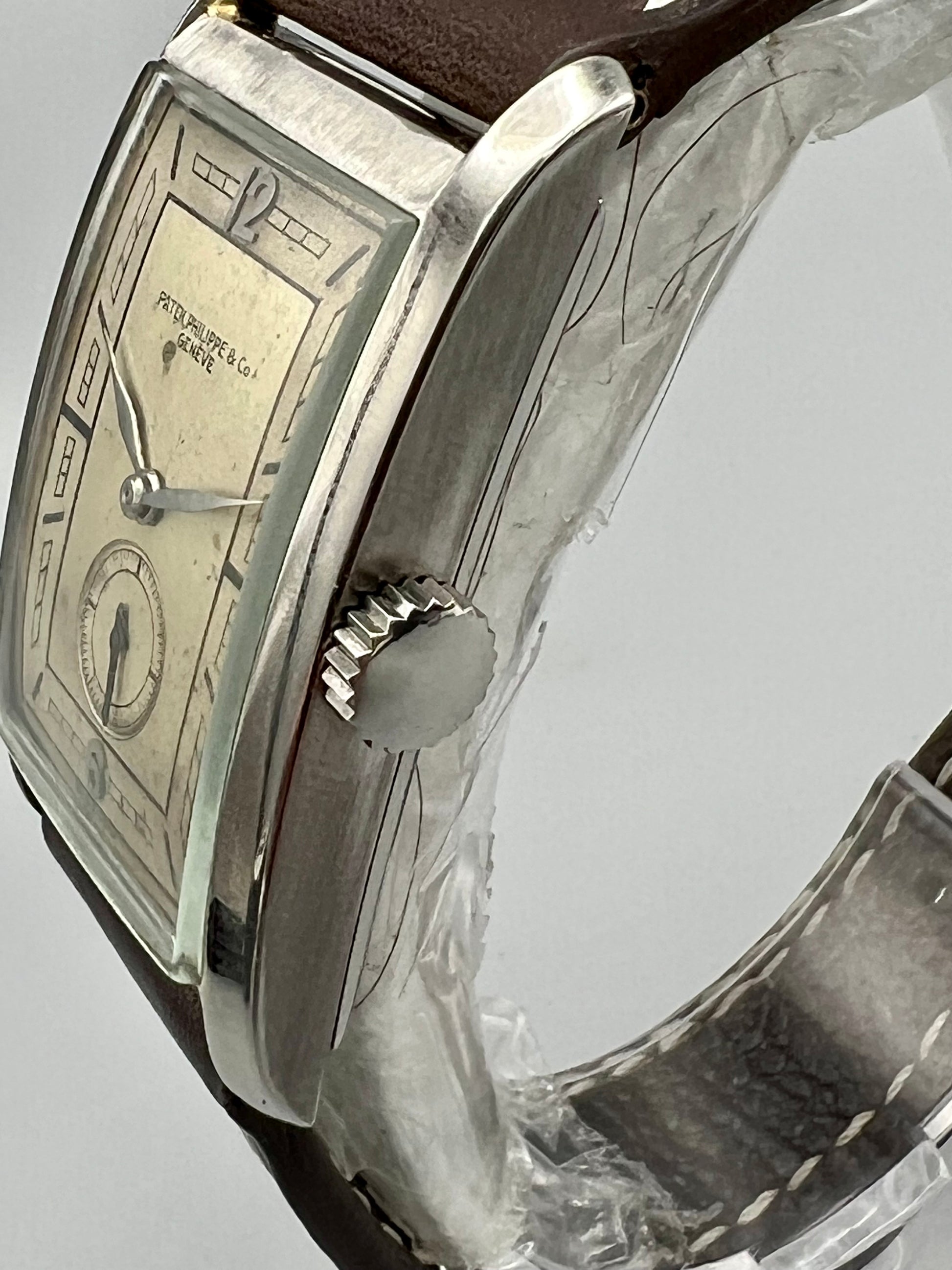 This is a rare early Patek wristwatch with an oversized curved stainless-steel case. This watch is all original and is in remarkable condition considering it is almost one hundred years old.