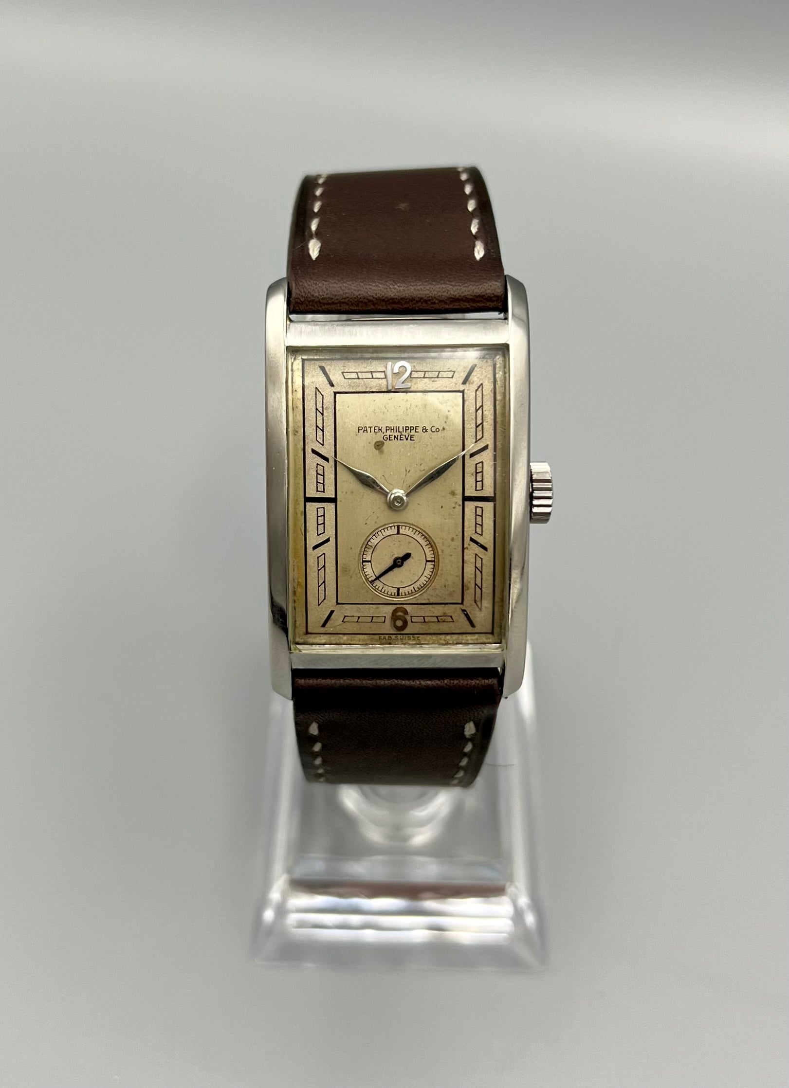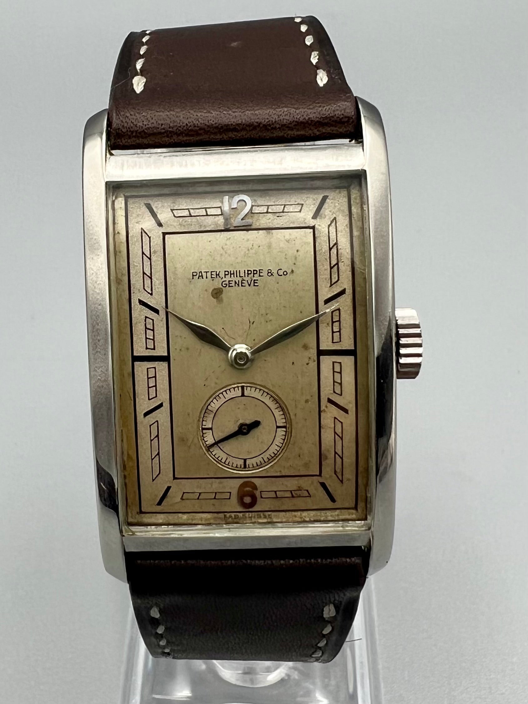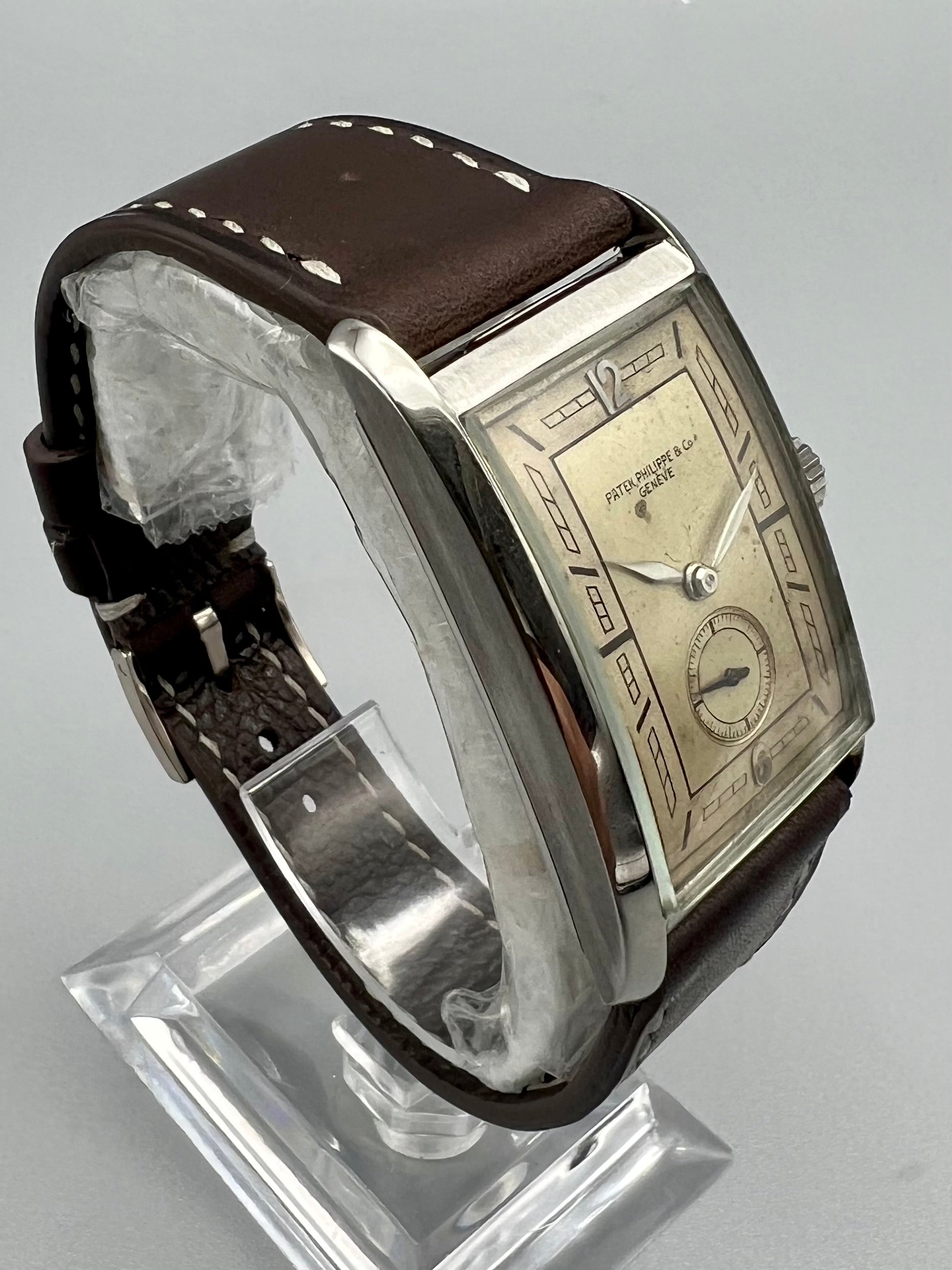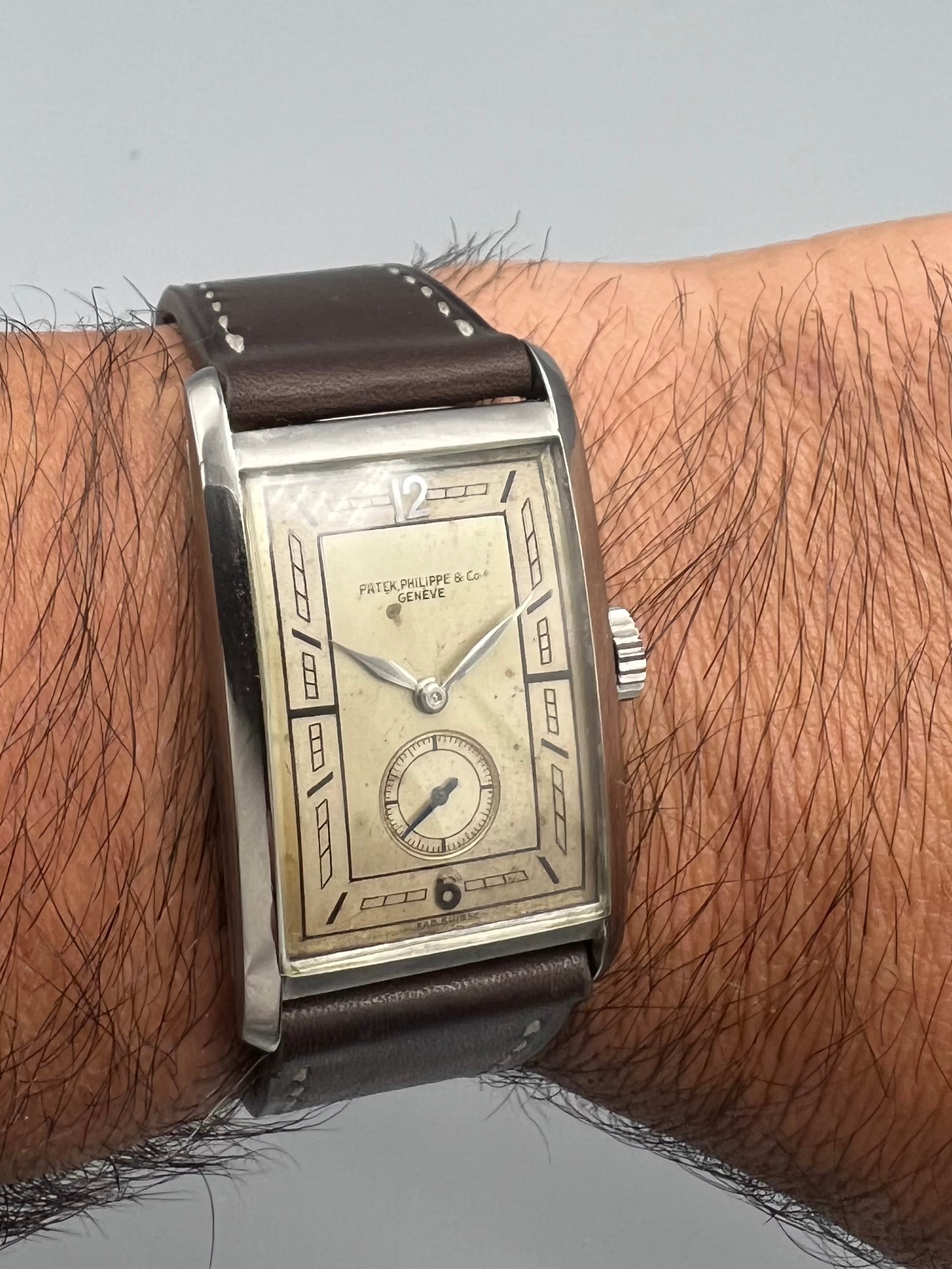This is a rare early Patek wristwatch with an oversized curved stainless-steel case. This watch is all original and is in remarkable condition considering it is almost one hundred years old.