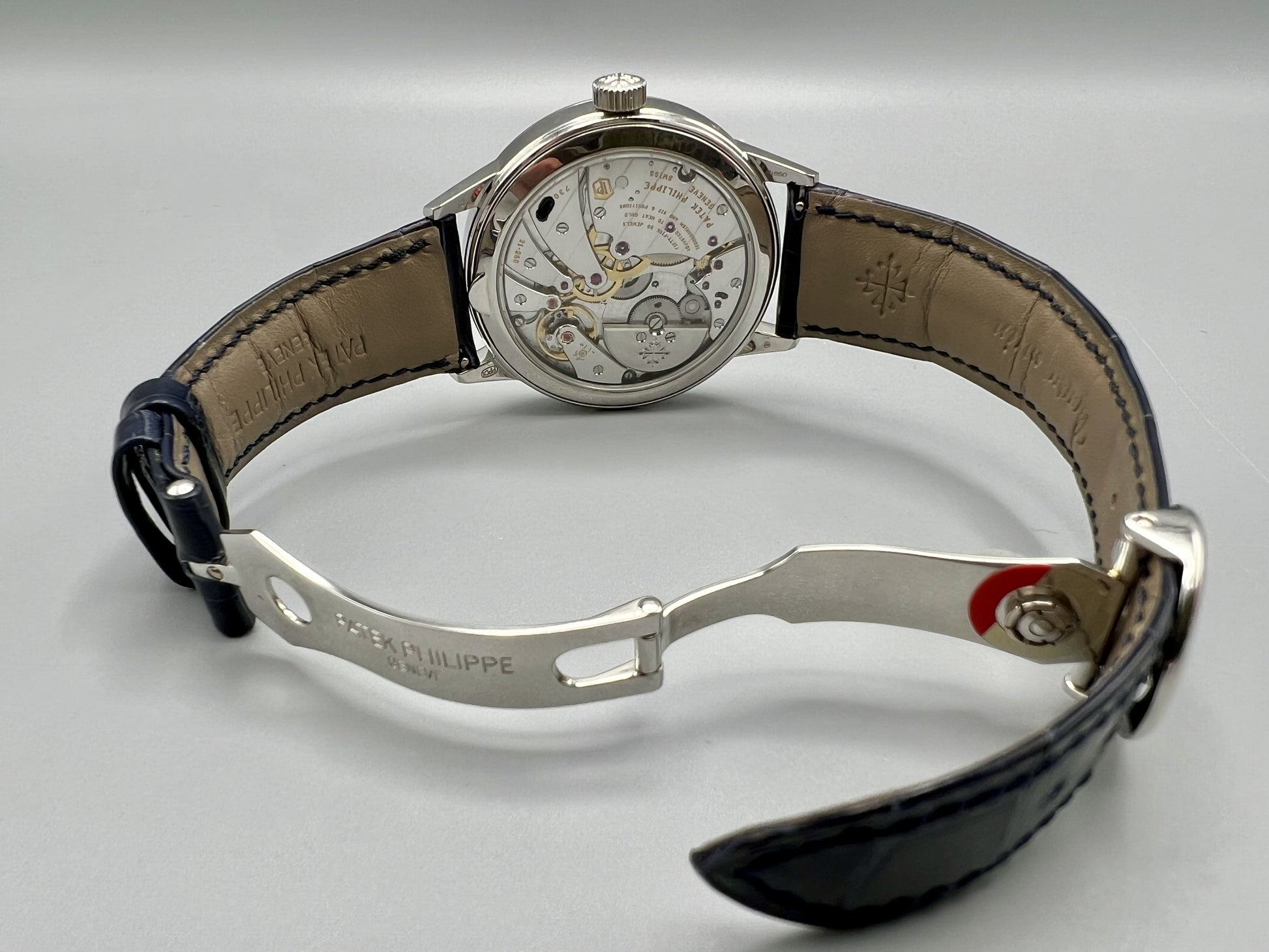 Putting an in-line perpetual calendar in a wristwatch is highly complex and requires many additional gears: Cal 31-260 which was developed for this watch with more than 500 moving parts. Patek uses a platinum microrotor in the new movement because the higher density of platinum over gold allows the automatic movement to wind more efficiently. To reduce friction and add efficiency the movement incorporates 55 jewels which is unprecedented for a calendar complication.