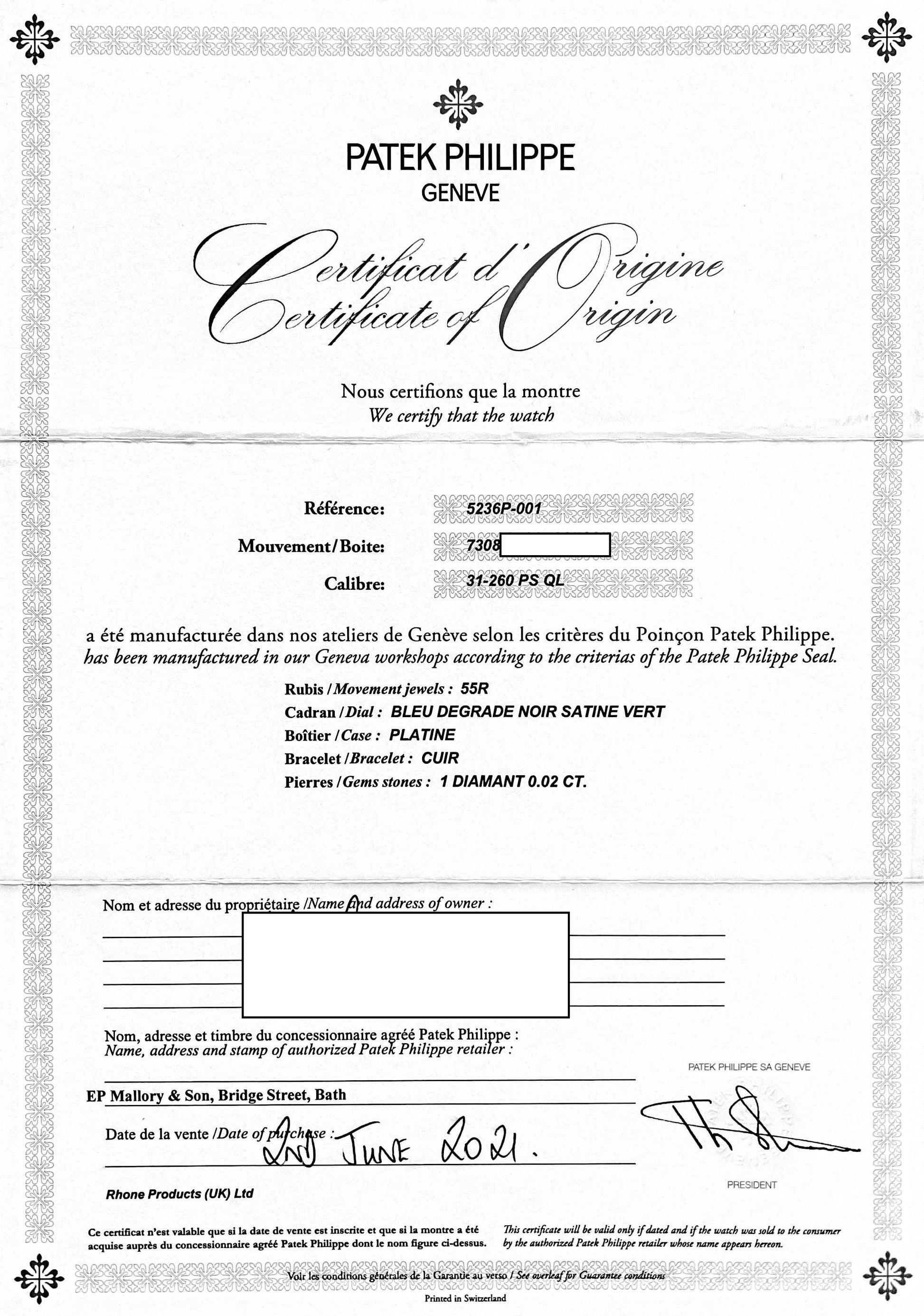 Patek Philippe Ref 5236P In-Line Perpetual Calendar in Platinum, As New Condition, 2021