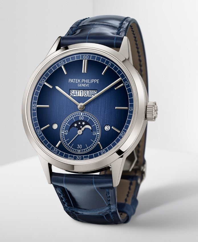 The design engineers at Patek developed a completely new self-winding movement 31-260 PS QL with an additional in-line display module, for which three patent applications have been filed. This highly sophisticated new caliber is housed in an elegant platinum case framing a vertical satin-finished blue dial with a black-gradient rim. The new movement not only delivers an original display, but it is also more legible and runs with greater reliability.
