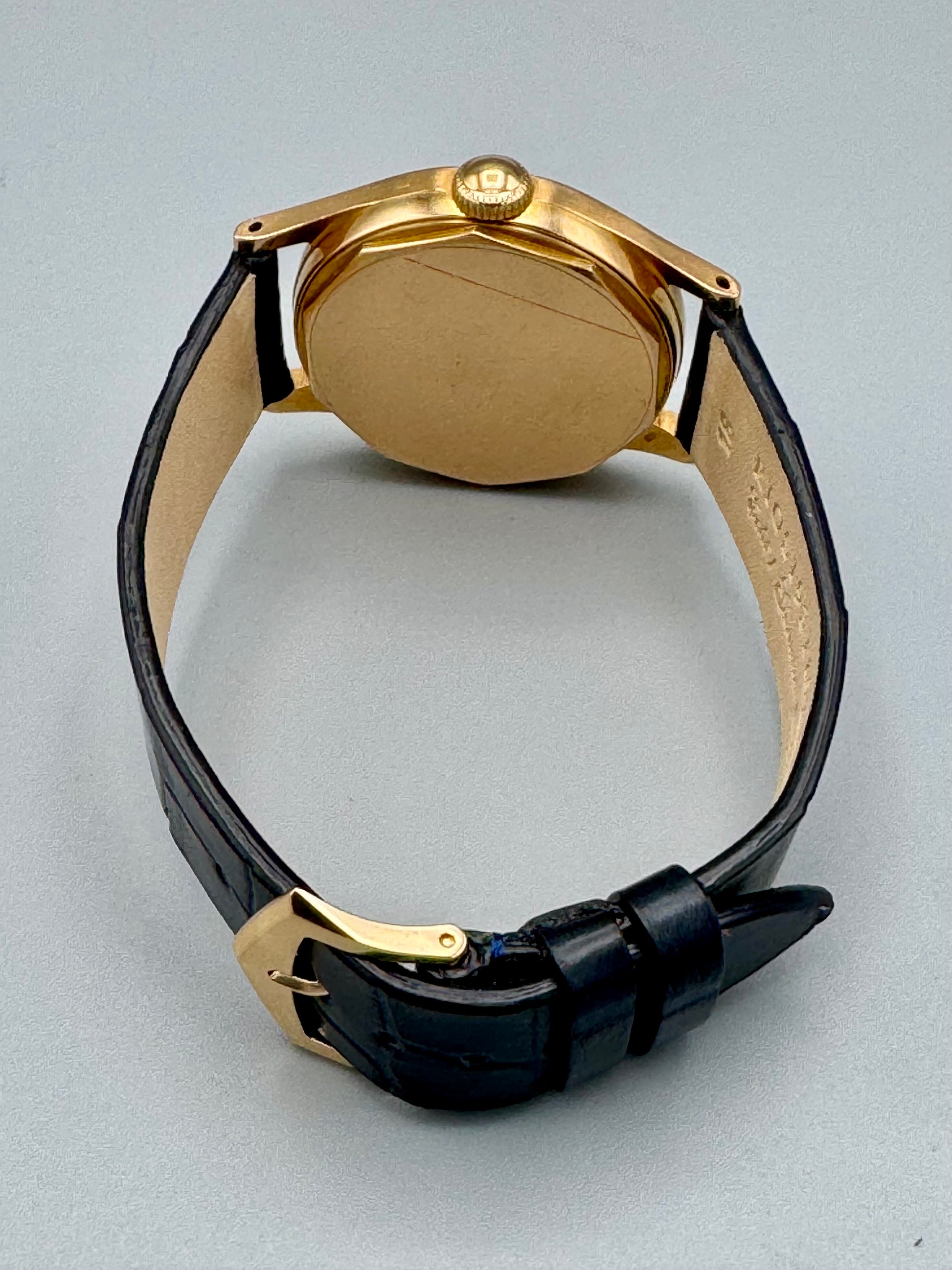 This example, encased in warm 18k rose gold, exemplifies one of the rarest configurations of the model. Although Reference 565 was predominantly manufactured in stainless steel or yellow gold, specimens crafted in rose gold (with fewer than ten made) are exceedingly rare, especially when found in such remarkable condition. The case, featuring bold, sculptural lugs and a robust 35 mm diameter, was gently polished in the past but it retains great lug proportions and a sharp hallmark under the lugs. The rich patina of this timepiece is testimonial to its age and authenticity.