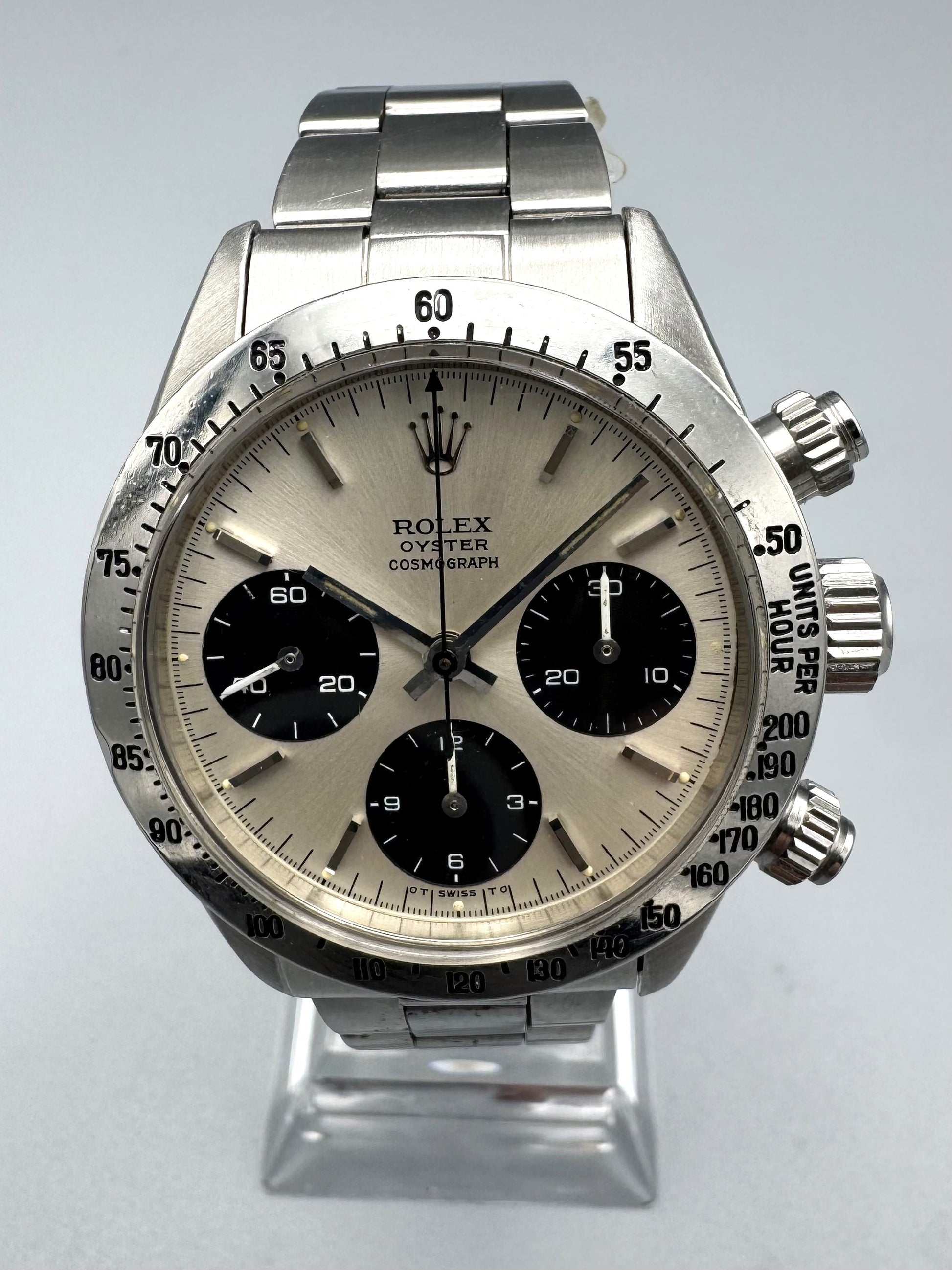 The reference 6265 occupies a prominent place in the history of the Rolex Cosmograph Daytona, combining robust screw-down pushers with the clean, functional lines of the Oyster case. The present watch, dating from 1971–72, represents one of the more appealing and elusive dial variations of the model.