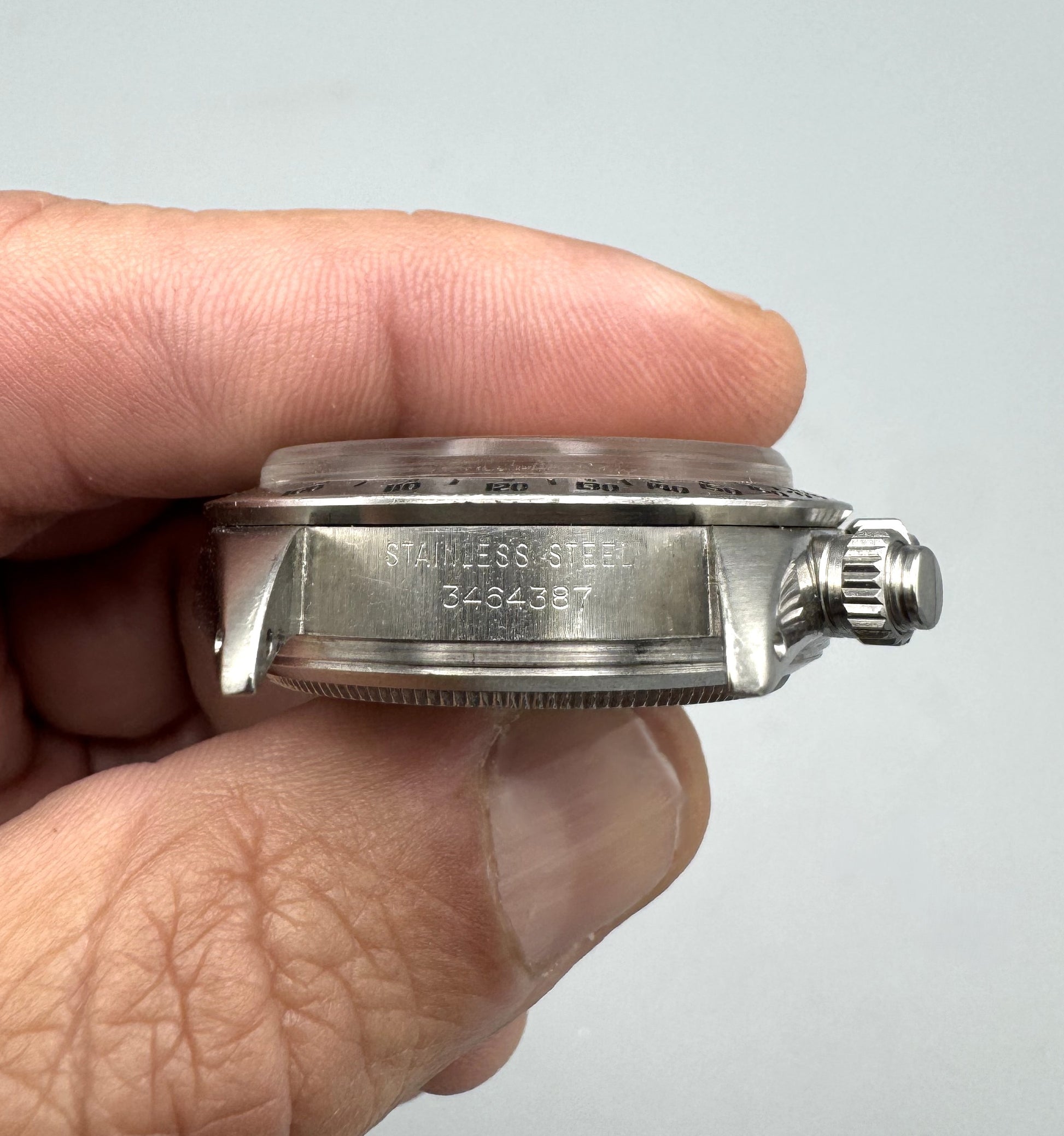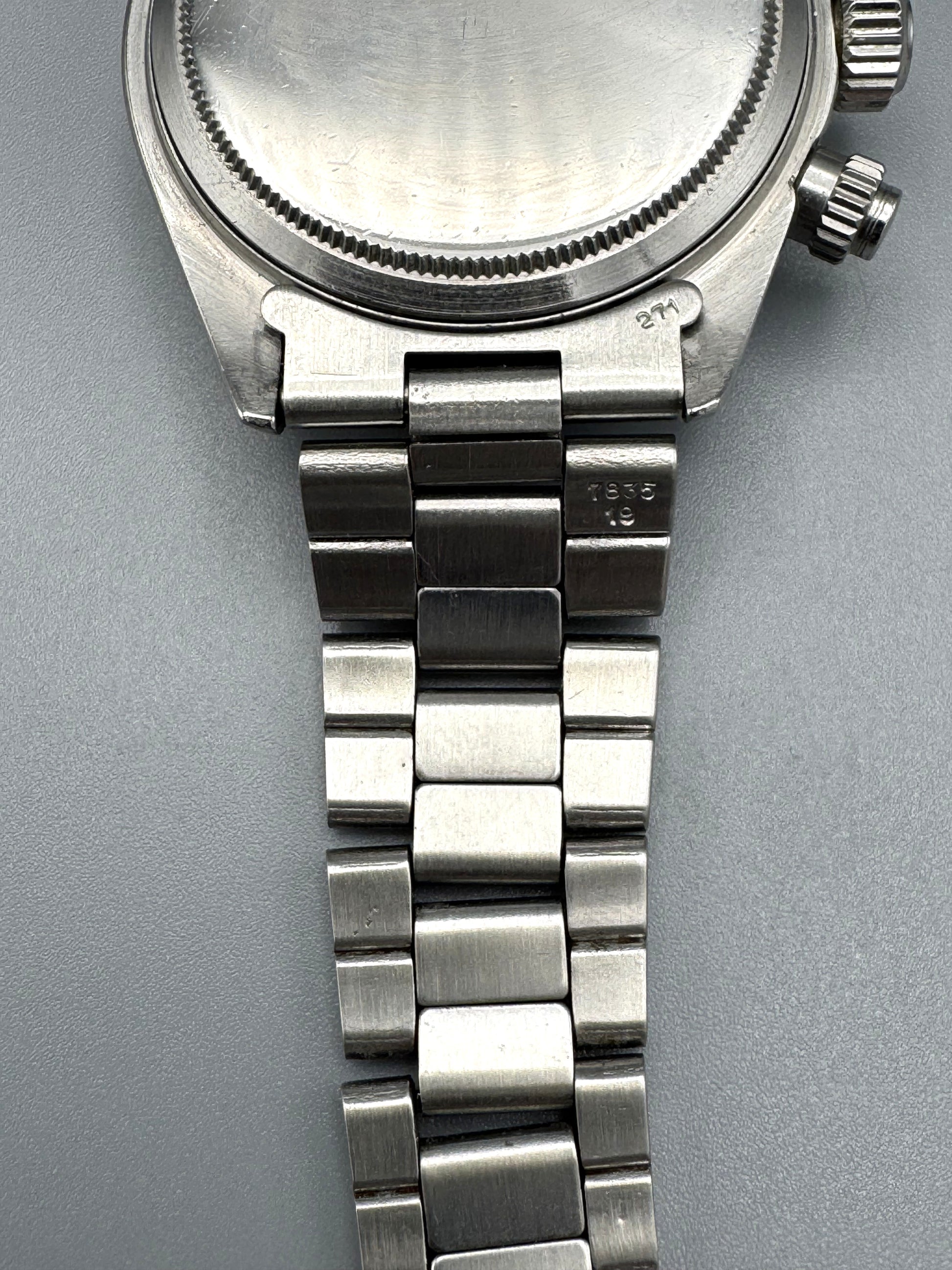 We believe the stainless-steel case has been lightly polished but retains its sharp edges and full proportions. Importantly, the serial and reference numbers remain perfectly legible between the lugs. The bezel, pushers, and caseback are all present as correct for the reference and era.