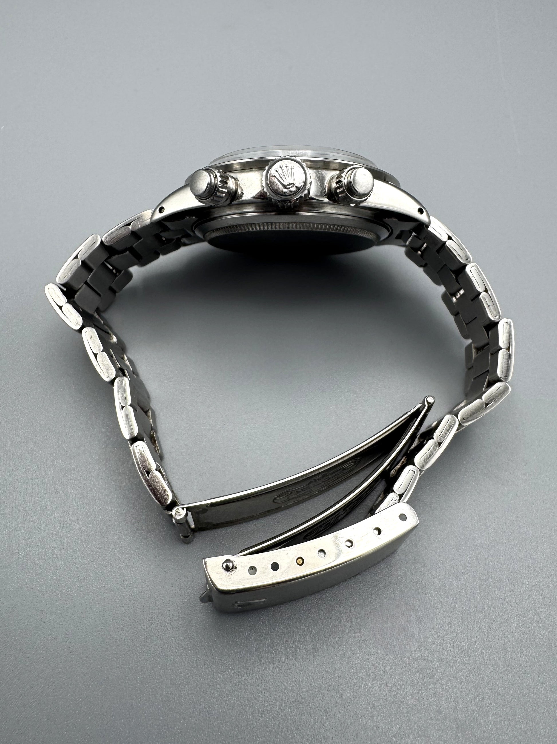 Its white “Sigma” dial, signed Cosmograph without the later Daytona designation, belongs to a short-lived production window seen only in the 3.0–3.4 million serial number range. This configuration is considered distinctive because only a limited number of Sigma examples were produced prior to the regular inclusion of the “Daytona” signature. The dial itself is outstanding — perfectly preserved with crisp printing, flawless sub-dials, and luminous hour plots that remain full and intact. Under blue light, both plots and hands glow evenly, confirming their originality and uniform aging.