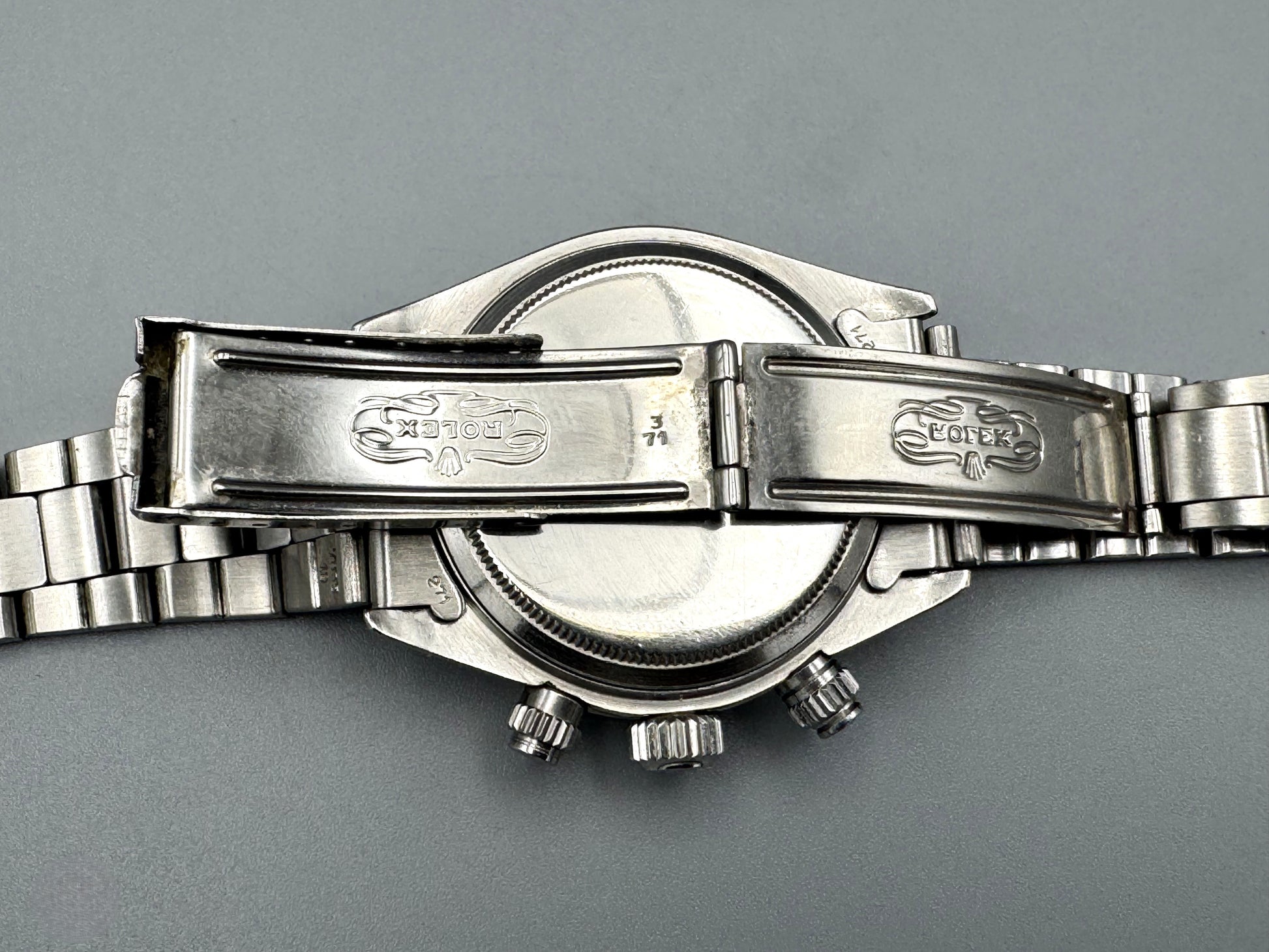 Completing the package is the original Rolex folded-link Oyster bracelet, reference 7835, with correct 271 end links dated 1971. Collectors will appreciate the scarcity of this original configuration; the bracelet, accompanied by the appropriate end links, is currently valued at approximately $5,000 in today’s market, highlighting the overall completeness of this example.