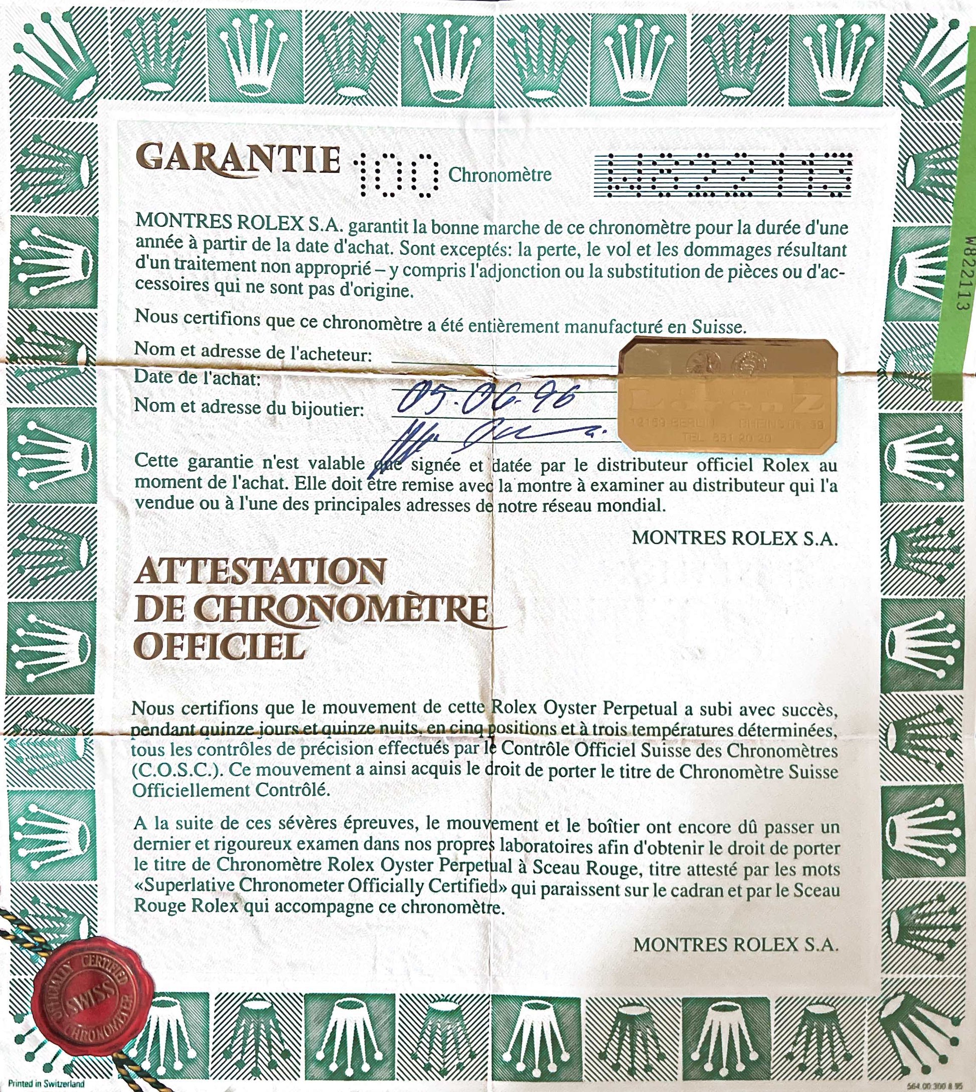 Some, not all, of the original black dial ref. 16520’s (made between 1994 and 1998) used an organic varnish, called Zapon, to protect Daytona’s face. Unrecognized at the time, the lacquer did not provide sufficient coverage and, over the years, the silver outer tracks on sub dials have oxidized, turning a definite golden-brown color as they react with UV rays. This phenomenon was discovered by Osvaldo Patrizzi, the watchmaker who founded Antiquorum Auctioneers and the dials were named after him.