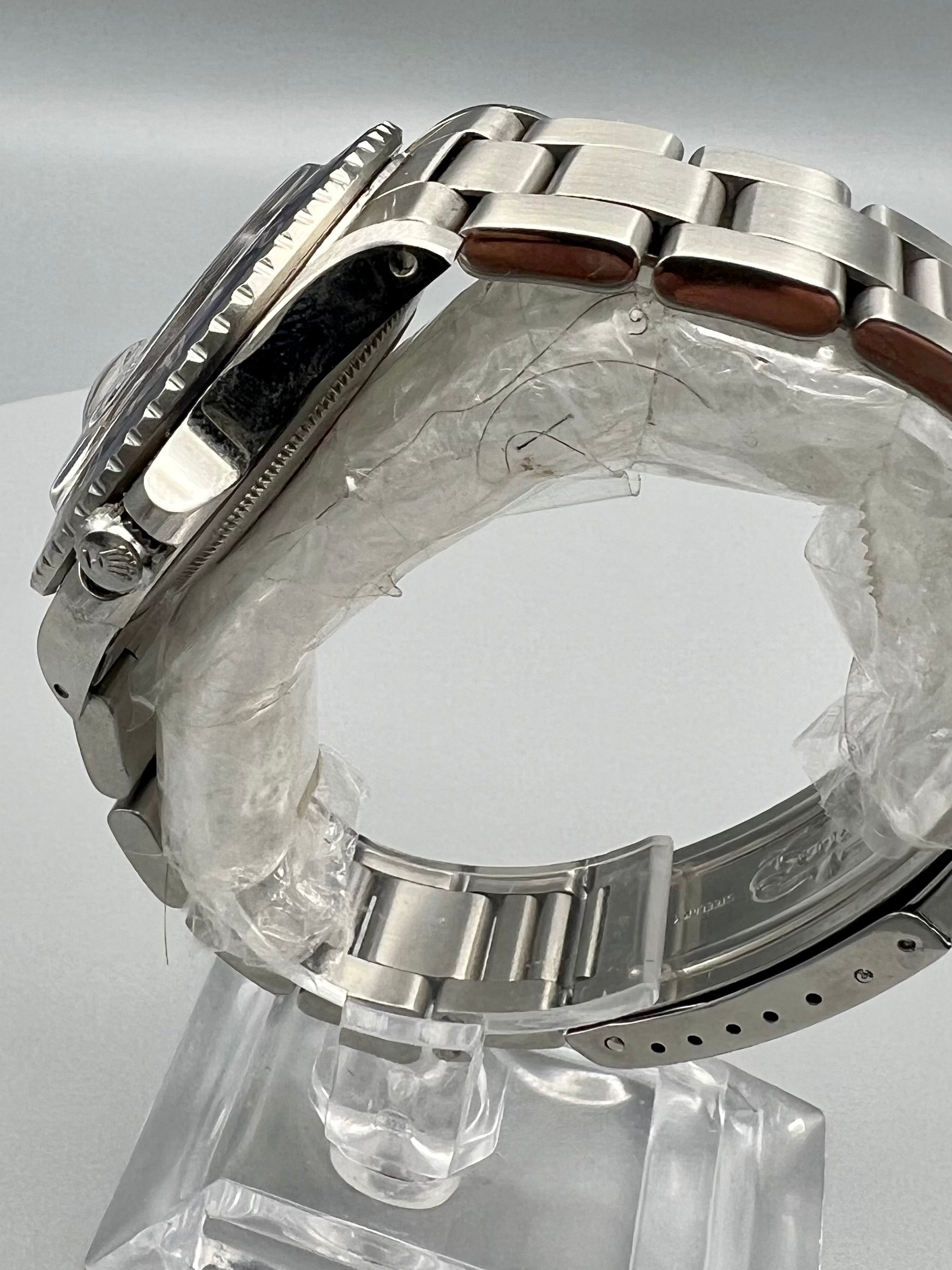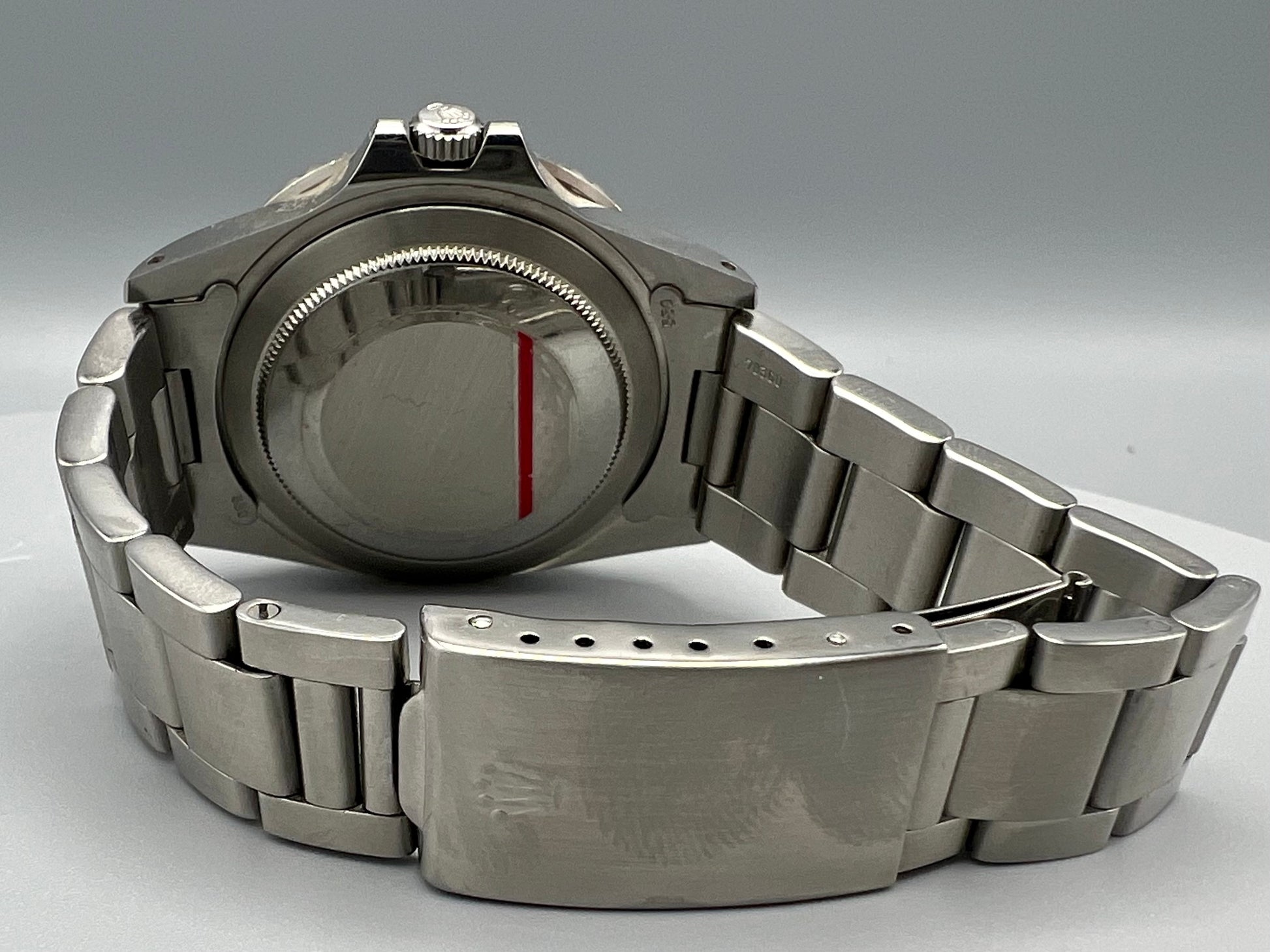 Movement is automatic, Rolex 1575, two time zone with 24-hour bi-directional bezel. The watch runs on a 27-jewel movement with a straight-line lever escapement, self-compensating Breguet balance spring, and free-sprung monometallic balance adjusted to heat/cold and 5 positions.