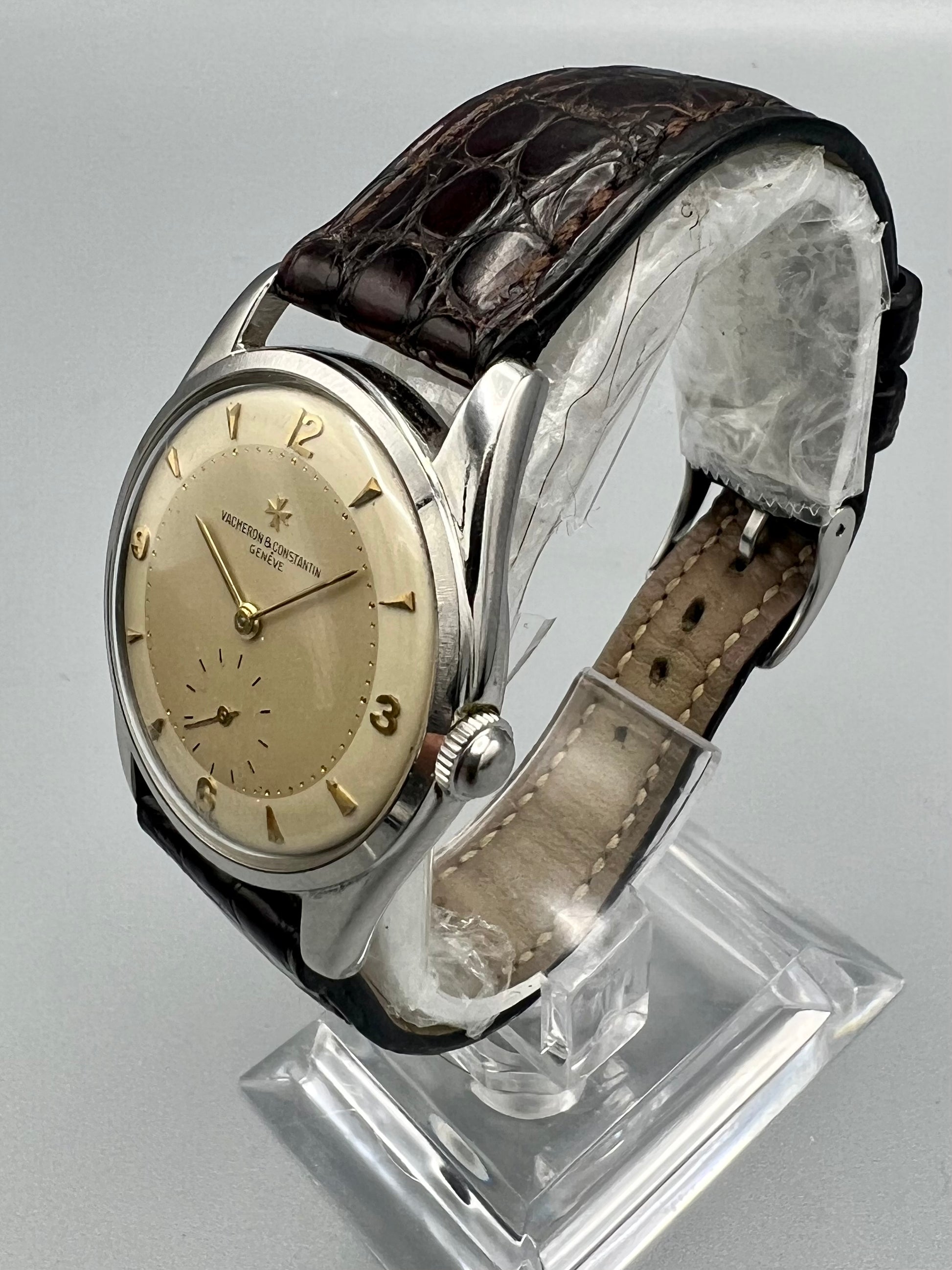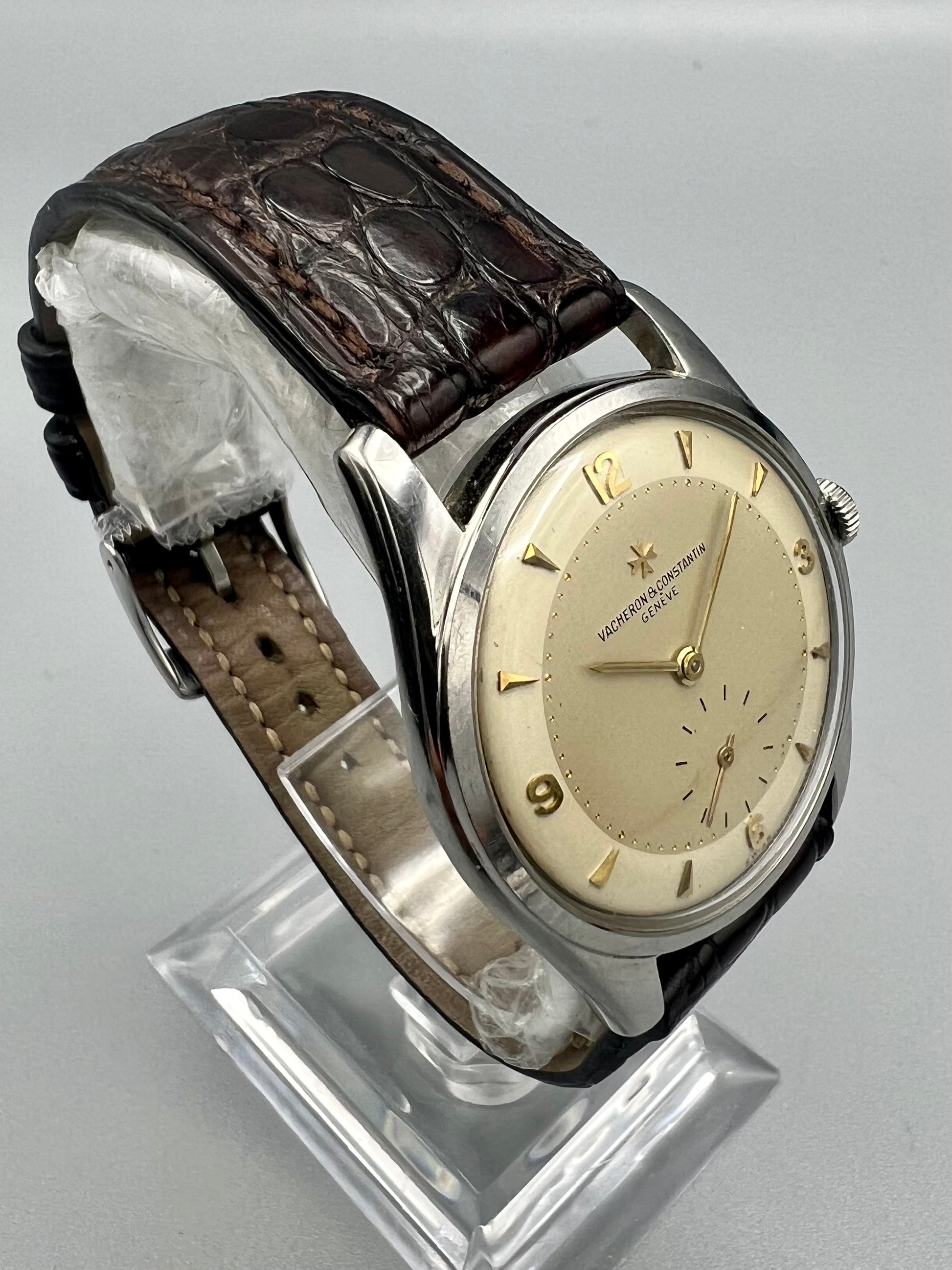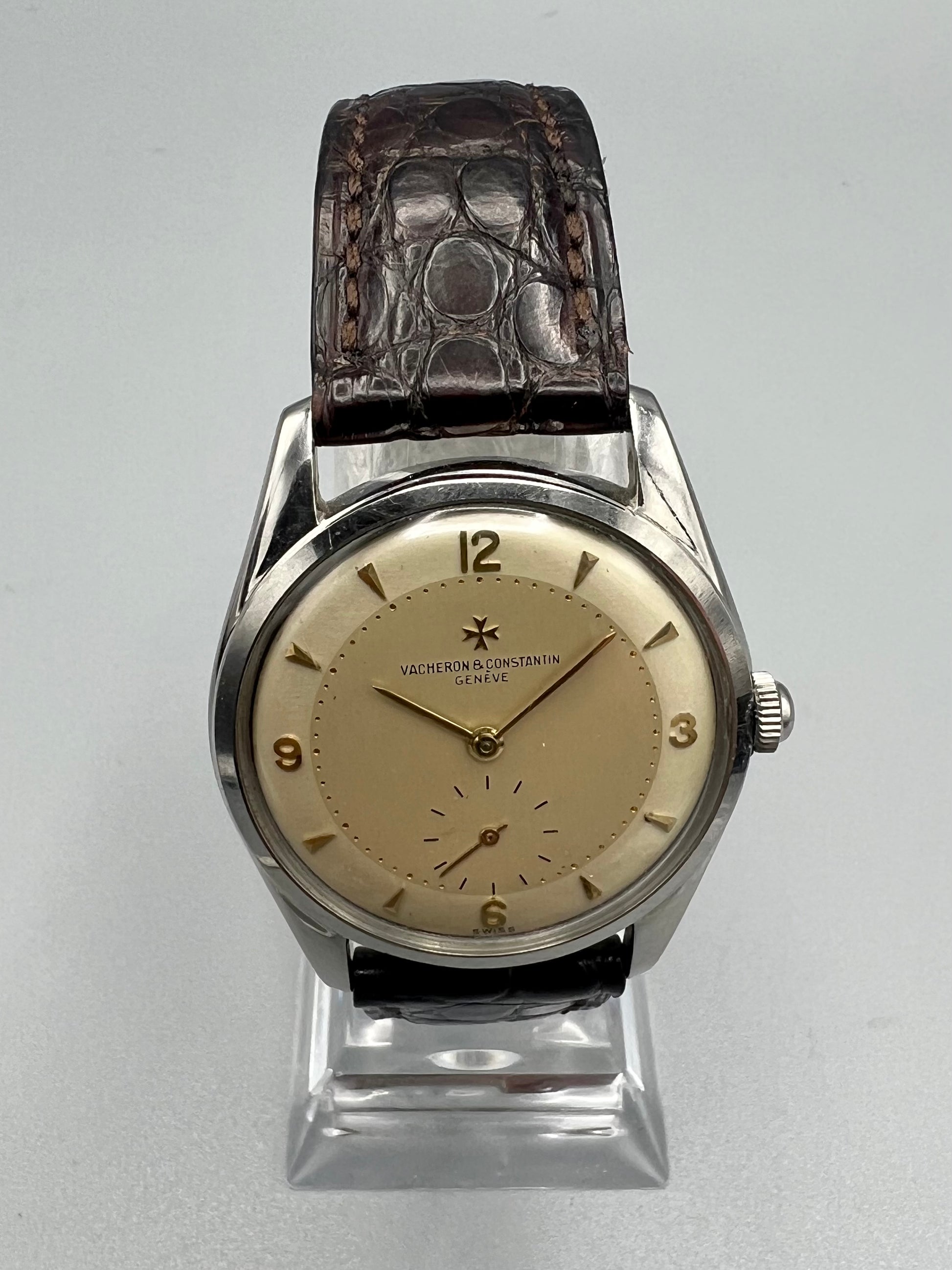 This is a rare Vacheron Constantin manual winding watch made in stainless steel with a rare two-tone dial and Arabic markers.