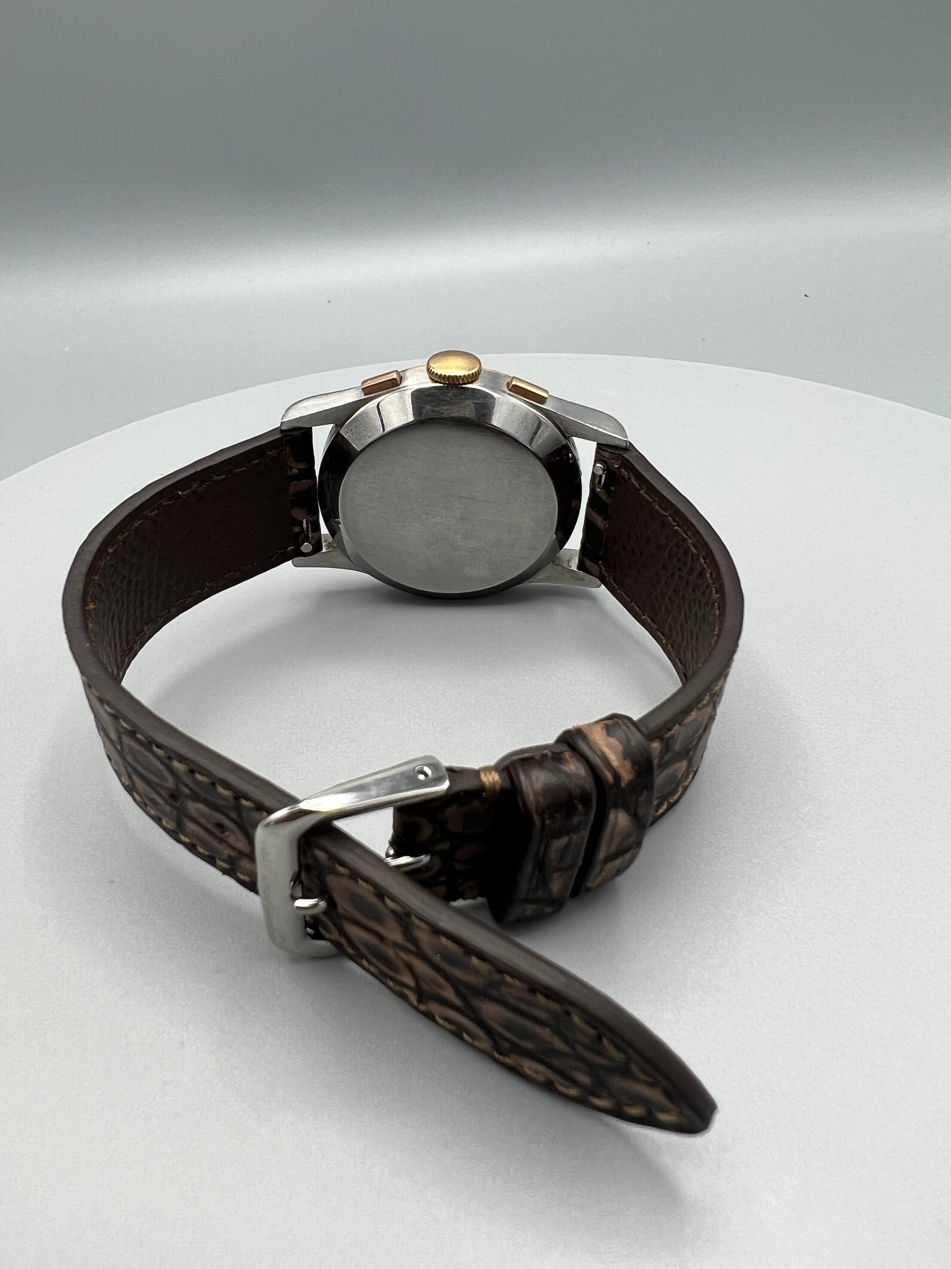In production from 1938 until the late 1960s the reference 4072 still exudes a highly contemporary elegance. Vacheron Constantin produced the watch with both the rare oval-shaped chronograph pushers, or as found on the present watch, with more modern, rectangular-shaped pushers. Furthermore, the 34mm case featured either a rare flat bezel such as our model or a beveled one. Less than 70 of the model were produced in a combination of steel and precious metals.