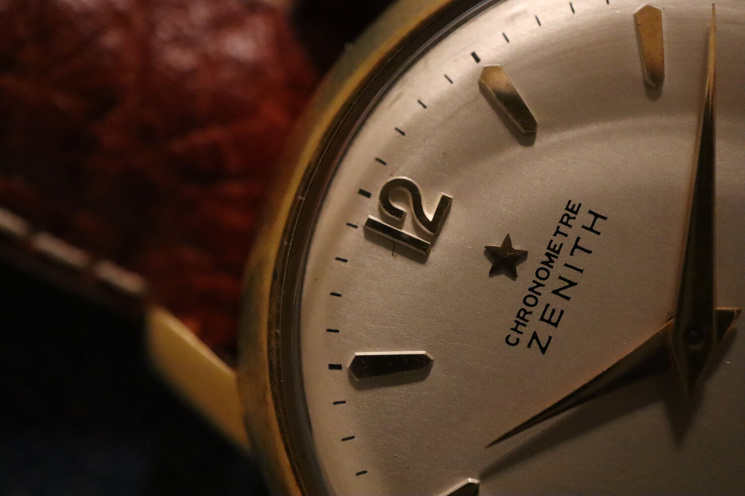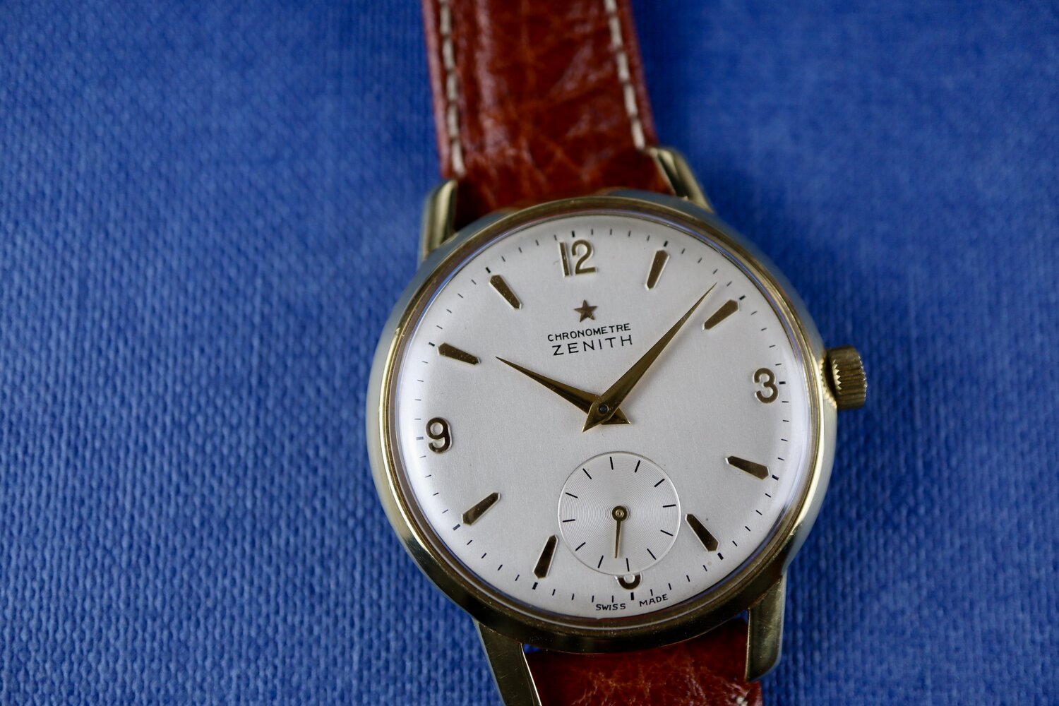 The watch features an original and untouched white dial with Arabic numerals at 3, 6, 9 and 12. Whereas the text on the dial is printed, the Zenith star logo is applied in gold.