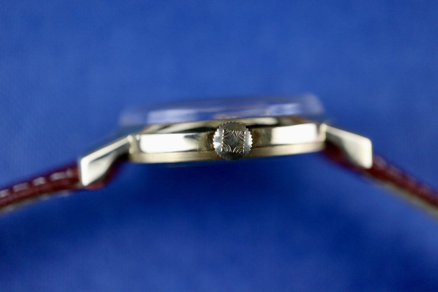 Owing to the exacting nature of producing a chronometer-grade watch, only 11,000 examples of Cal 135 were produced from 1949-1962. There were three variations of the movement, with competition-grade series 1 and 2 being the most desirable, because the finishing of the decoration was the most refined. The only difference in series 1 and 2 is that in the second series the micrometer adjustment was changed from a round-headed pin to a screw. According to our research, the present example, bearing movement number 4663543 is from the second series produced between 1954 and 1960.