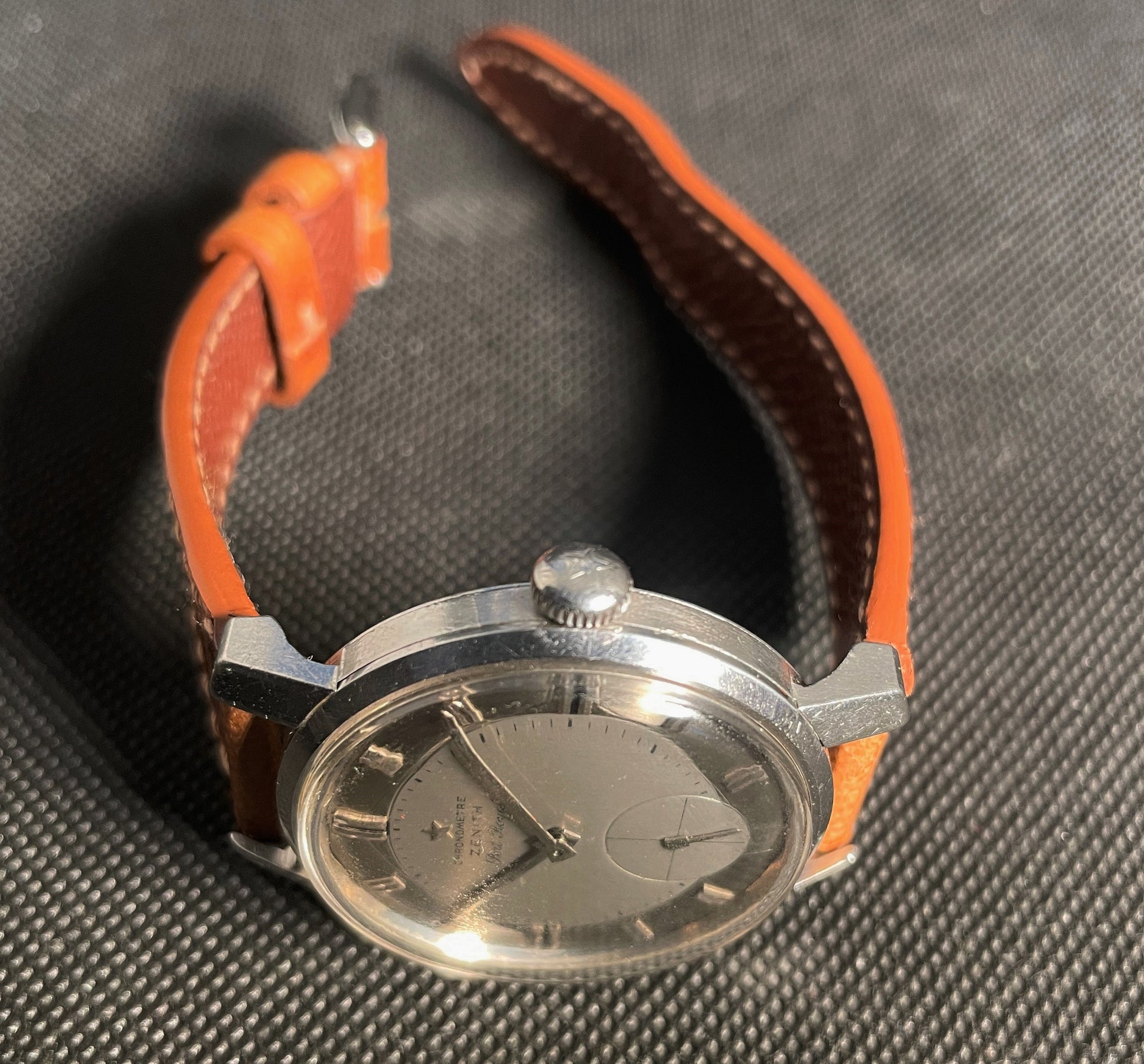 The watch features an original and untouched two-tome silver dial. The Zenith star logo and hour markers are applied.